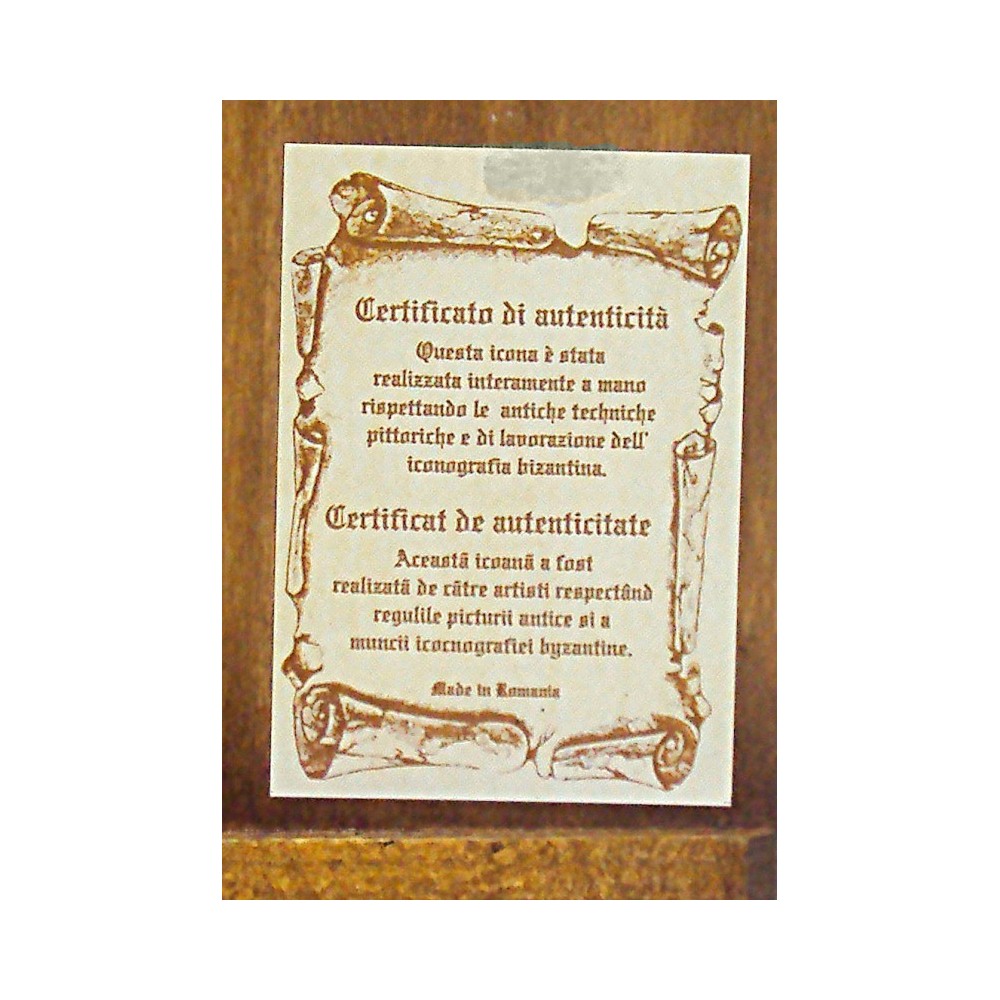 Mis.: cm 40X60. Dipinta a mano nel rispetto dei canoni della tradizione iconografica bizantina su foglia oro. Corredata di certificato di autenticità applicato sul retro.