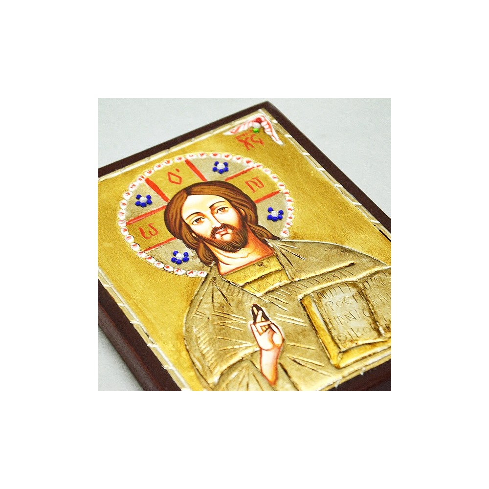 Icona Rumena dipinta a mano con foglia oro, immagine Gesu' Pantocratore. Realizzata nel rispetto della tecnica iconografica su legno massello. Corredata di certificato di autenticità applicato sul retro e scatola blu in velluto.