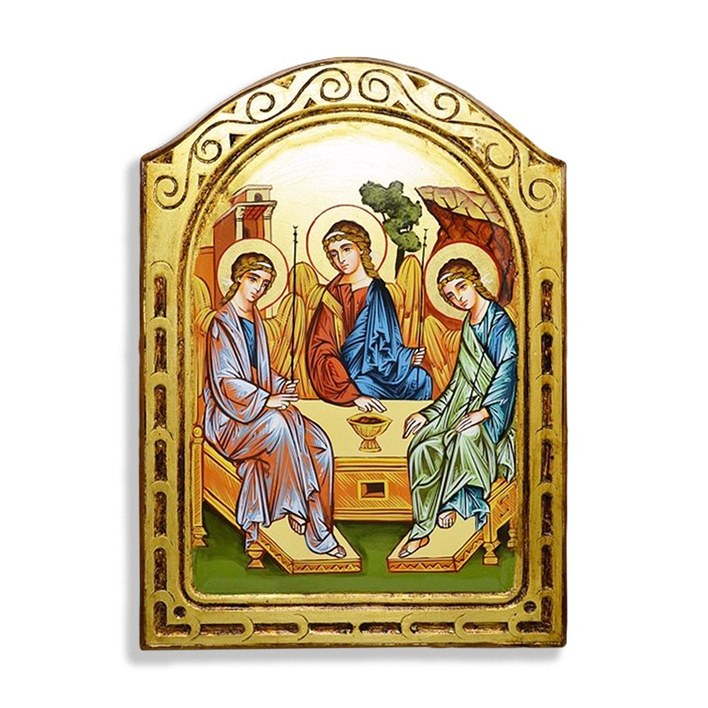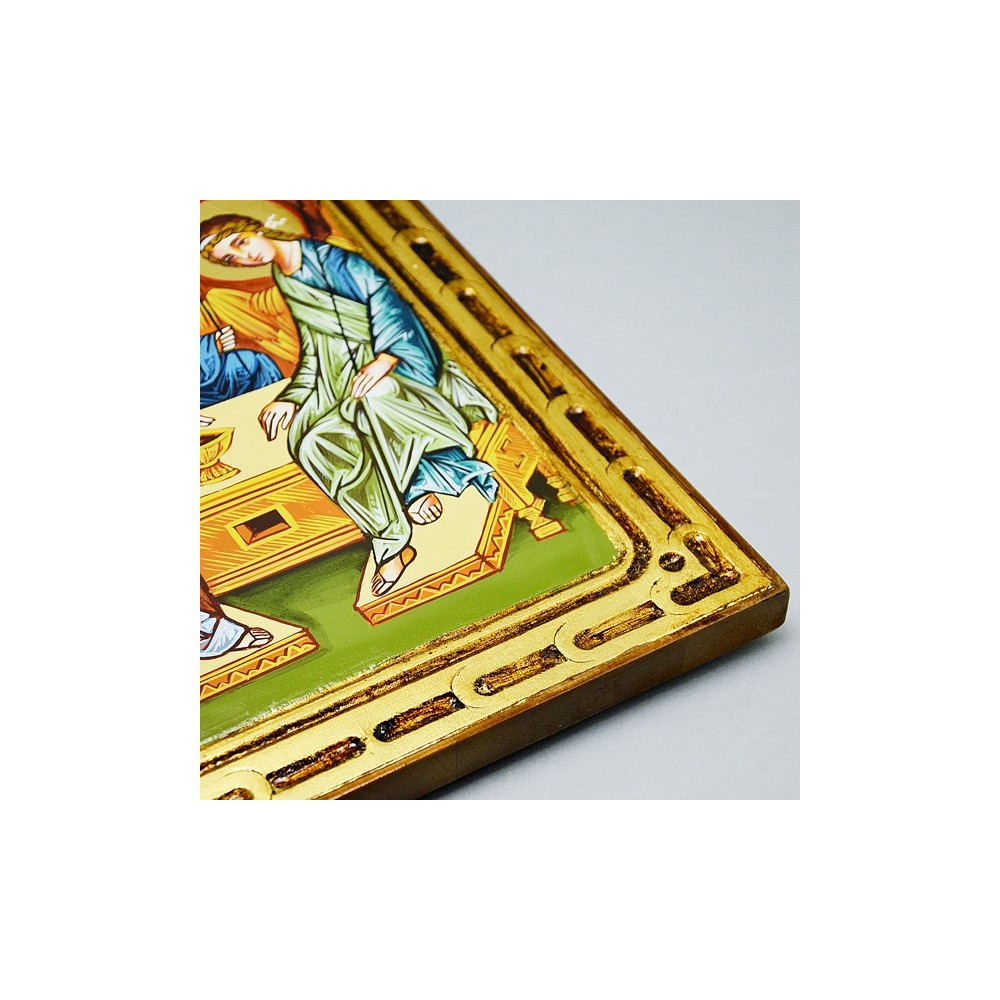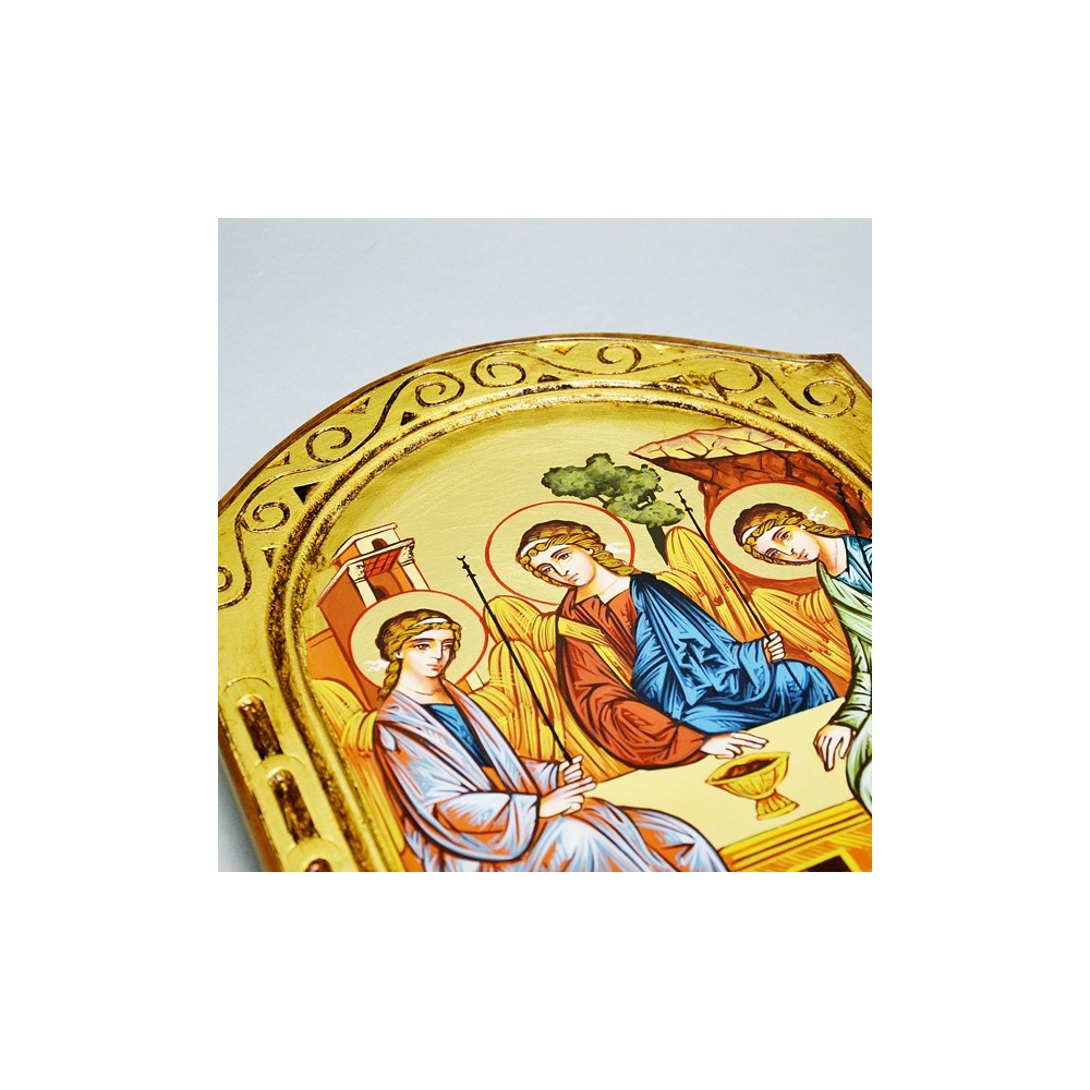 Icona Rumena dipinta a mano con foglia oro, immagine S.S Trinità. Realizzata nel rispetto della tecnica iconografica su legno massello. Corredata di certificato di autenticità applicato sul retro e scatola blu in velluto.
