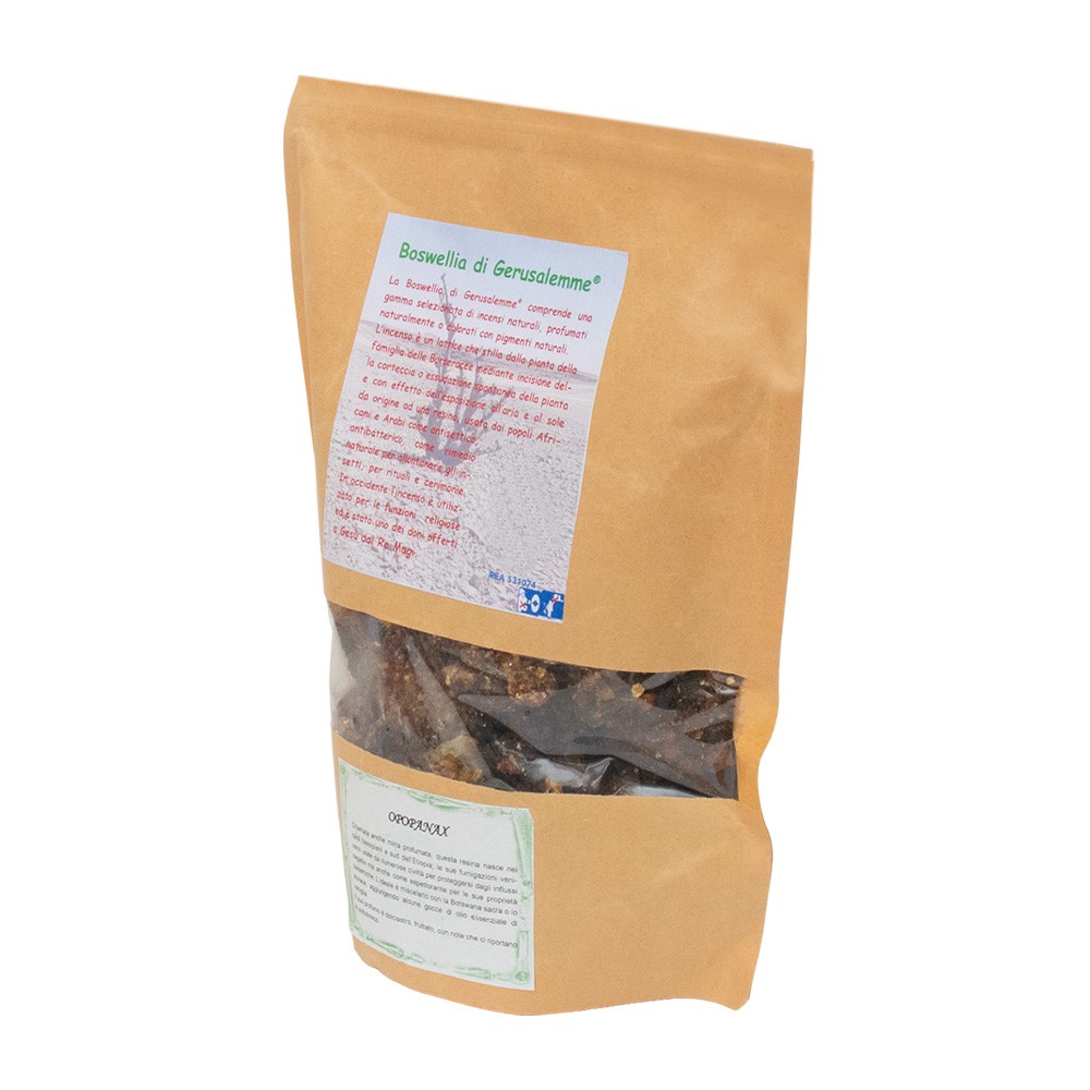 OPOPANAX, chiamata anche mirra profumata, questa resina nasce nei caldi bassipiani a sud dell'Etiopia; le sue fumigazioni venivano usate da numerose civiltà per proteggersi dagli influssi negativi ma anche come espettorante per le sue proprietà balsamiche. L'ideale è miscelarlo con la Botswana sacra o lo storace, aggiungendo alcune gocce, di olio essenziale di vaniglia.