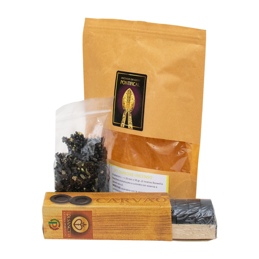 Confezione completa di 10 carboncini e 50 gr di incenso liturgico profumato.