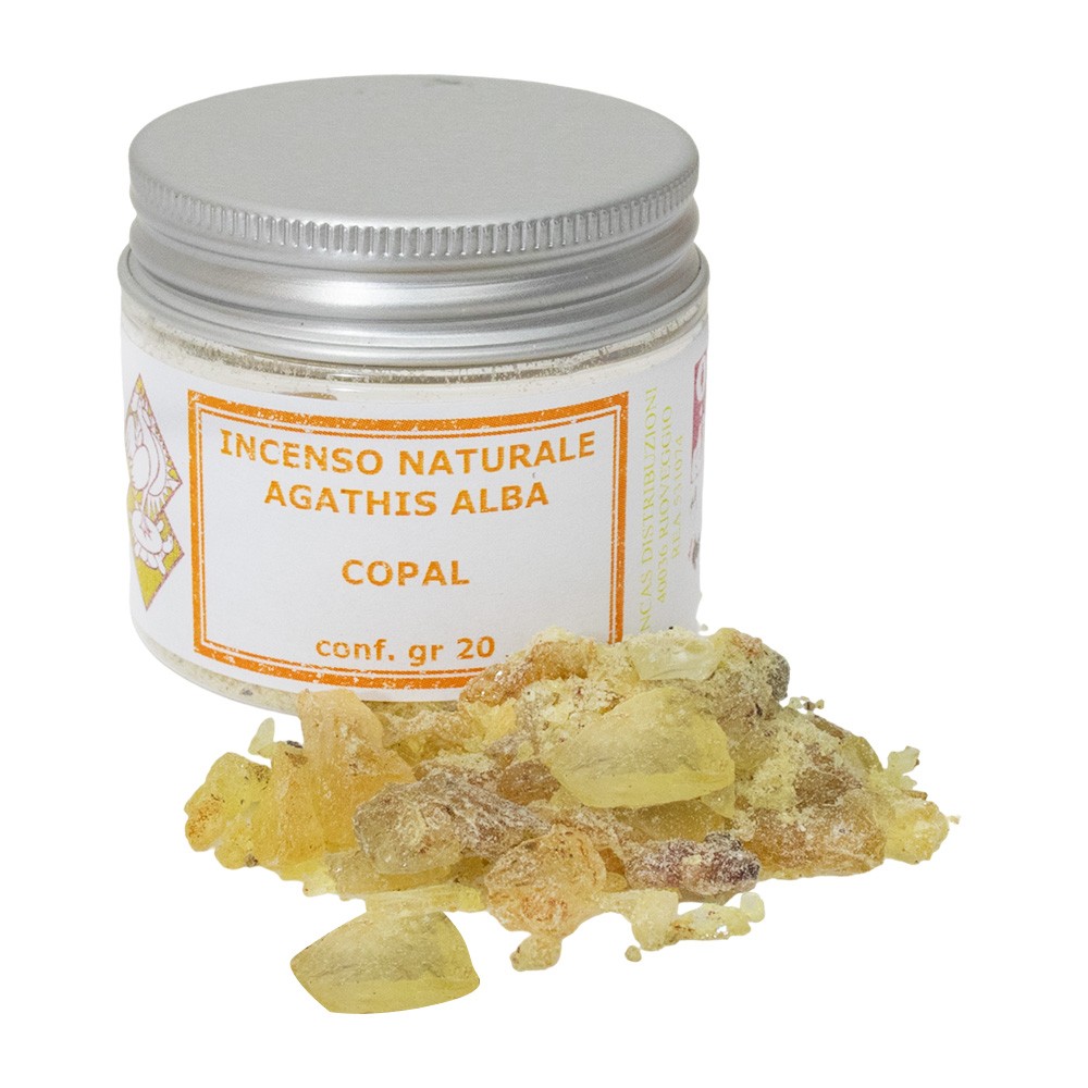 Incenso naturale AGATHIS ALBA COPAL, confezionato in pratico barattolino in plastica con tappo in alluminio.
