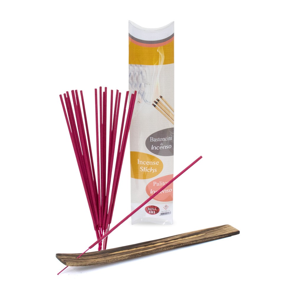 Confezione completa con bastoncini di incenso alle rose e porta-incenso in legno.