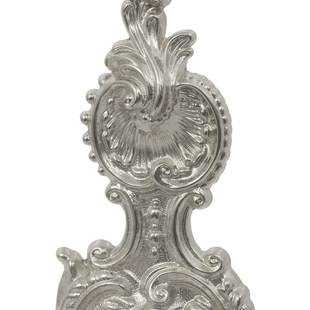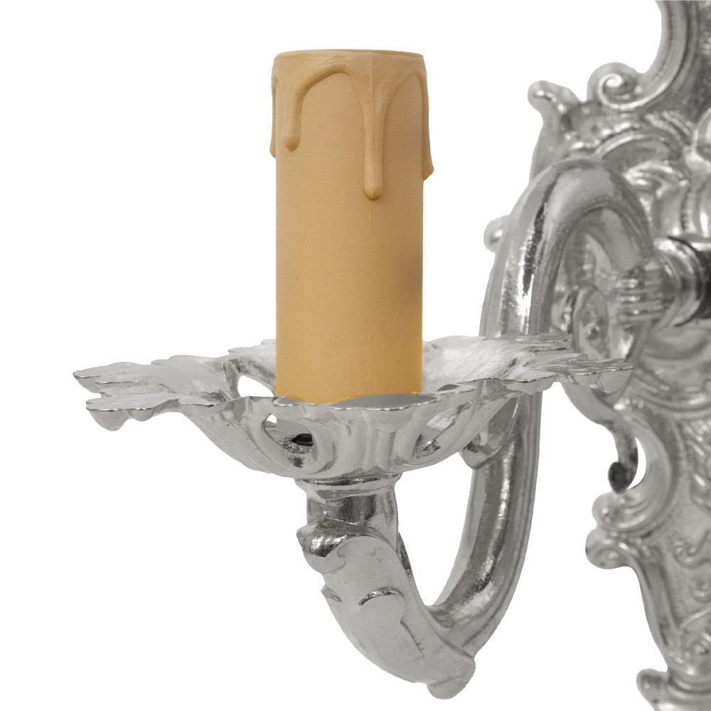 Questa lampada in stile 700 barocco è in ottone con finitura argentata, completa di bossolo portacandela di diametro 2 cm. Le lampadine non sono incluse (raccomandiamo di non usare lampadine con assorbimento superiore ai 40 w).