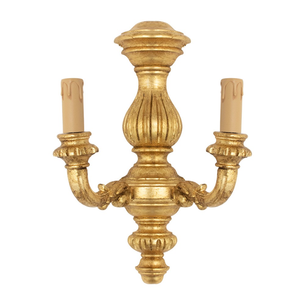 Realizzata interamente in legno con finitura dorata e antichizzata in stile barocco, completa di due bossoli portacandela in plastica color avorio di diametro 2,5 cm. Le lampadine non sono incluse.
