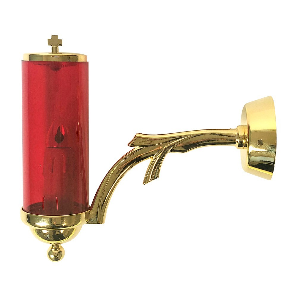 Realizzato in ottone dorato lucido. Completo di staffa per appenderlo alla parete, candela in plastica e bicchiere di colore rosso. Produzione made in Italy.