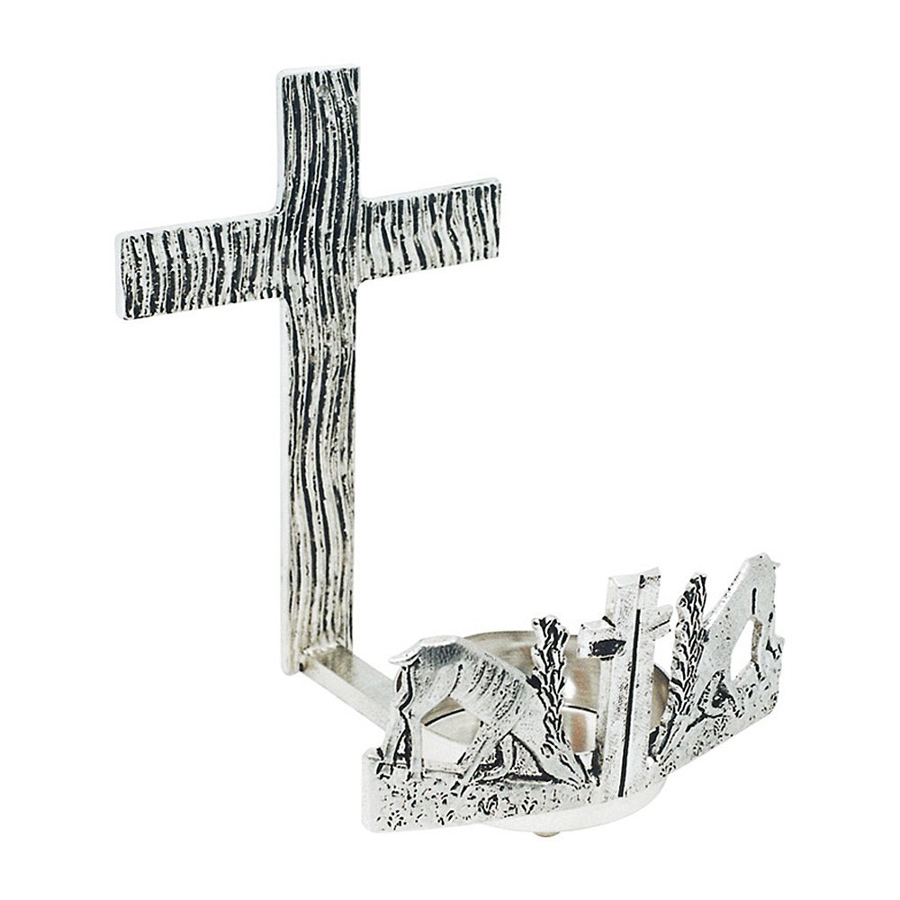 Portalampada da muro per il Santissimo Sacramento. Questo bellissimo arredo sacro è realizzato in ottone con finitura argento e riporta decori raffiguranti una croce e cervi che si abbeverano alla fonte. Ideale per ogni cappella.