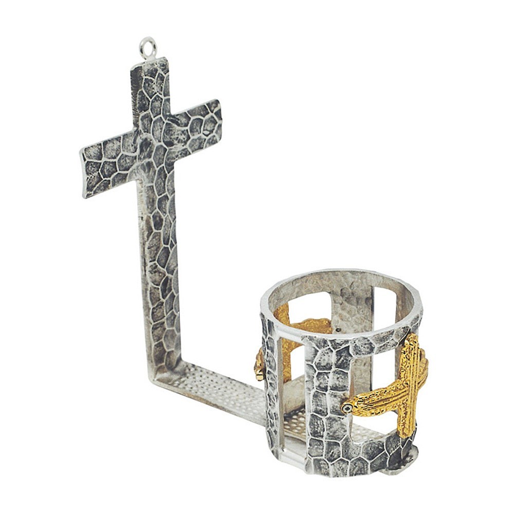 Porta lampada per il Santissimo Sacramento da muro. La lampada è in ottone bicolore ed è decorata con una croce dorata. Questa lampada può contenere sia il bicchiere che il cerone prosso per il Santissimo Sacramento.