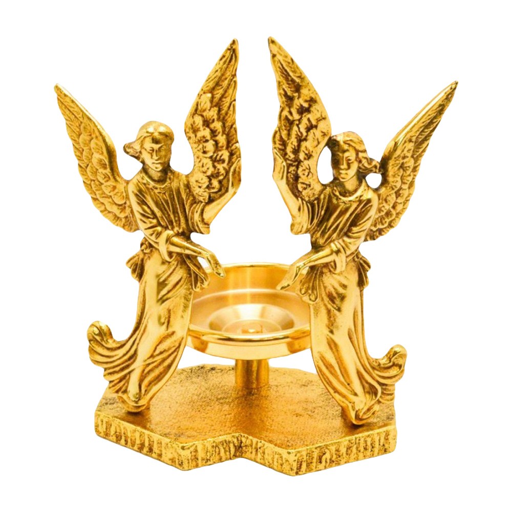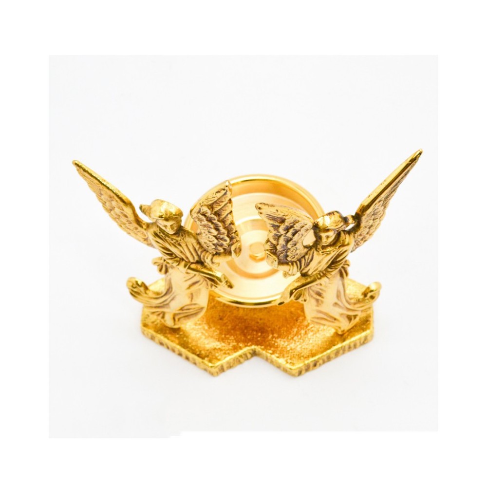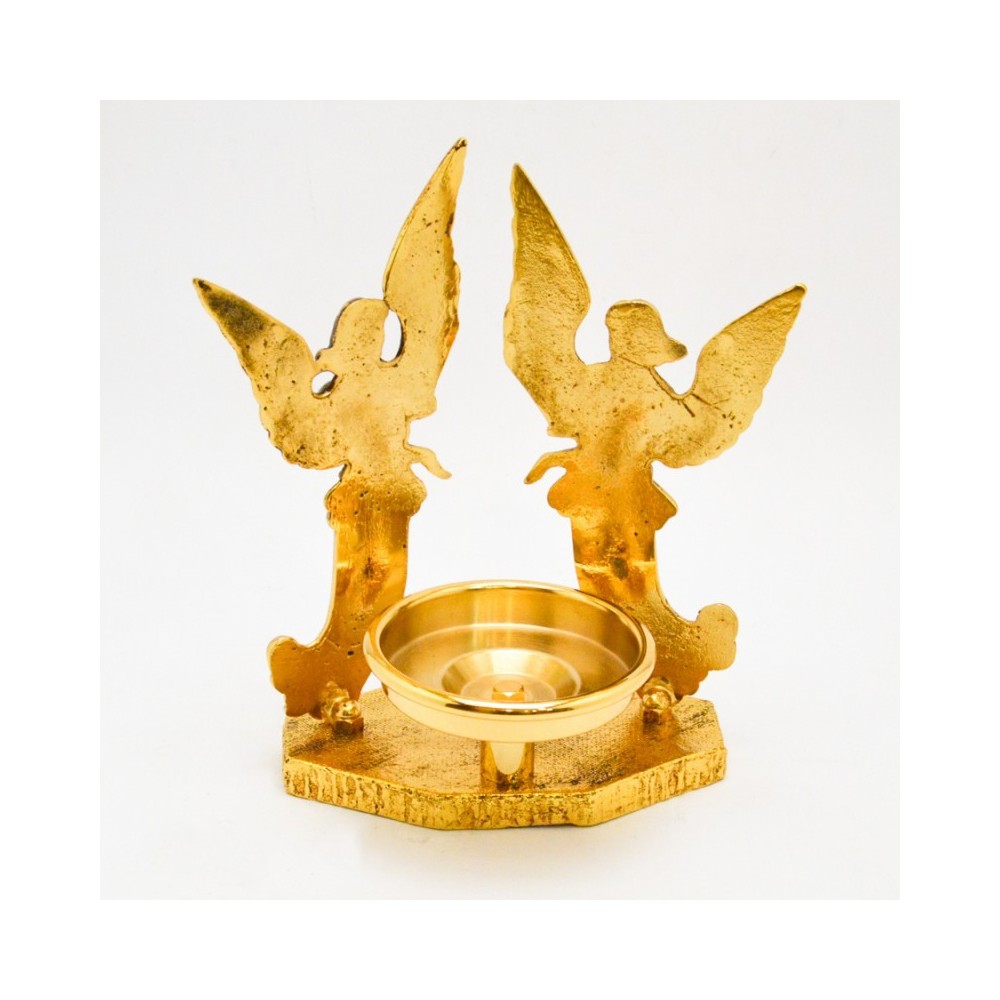 Fra i porta lampada del Santissimo è il più richiesto. Questo arredo sacro è realizzato interamente in ottone dorato, gli angeli sono alti 21 cm il diametro del bicchierino porta cero è 8 cm. Ideale per esaltare la luce liturgica davanti al tabernacolo.