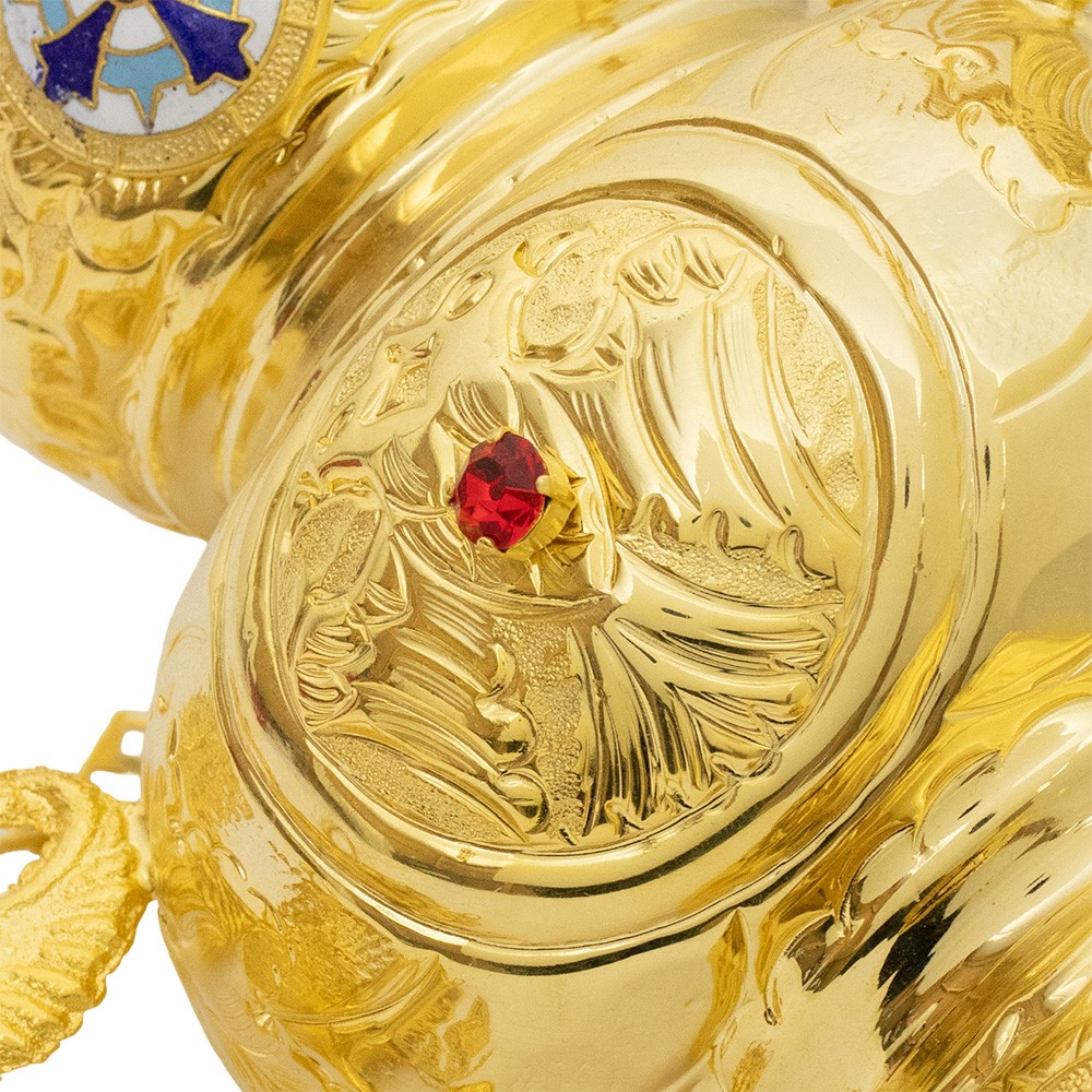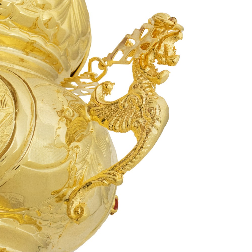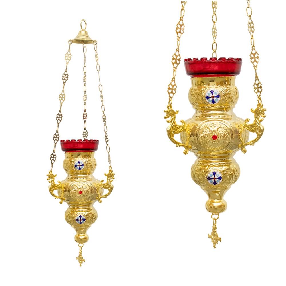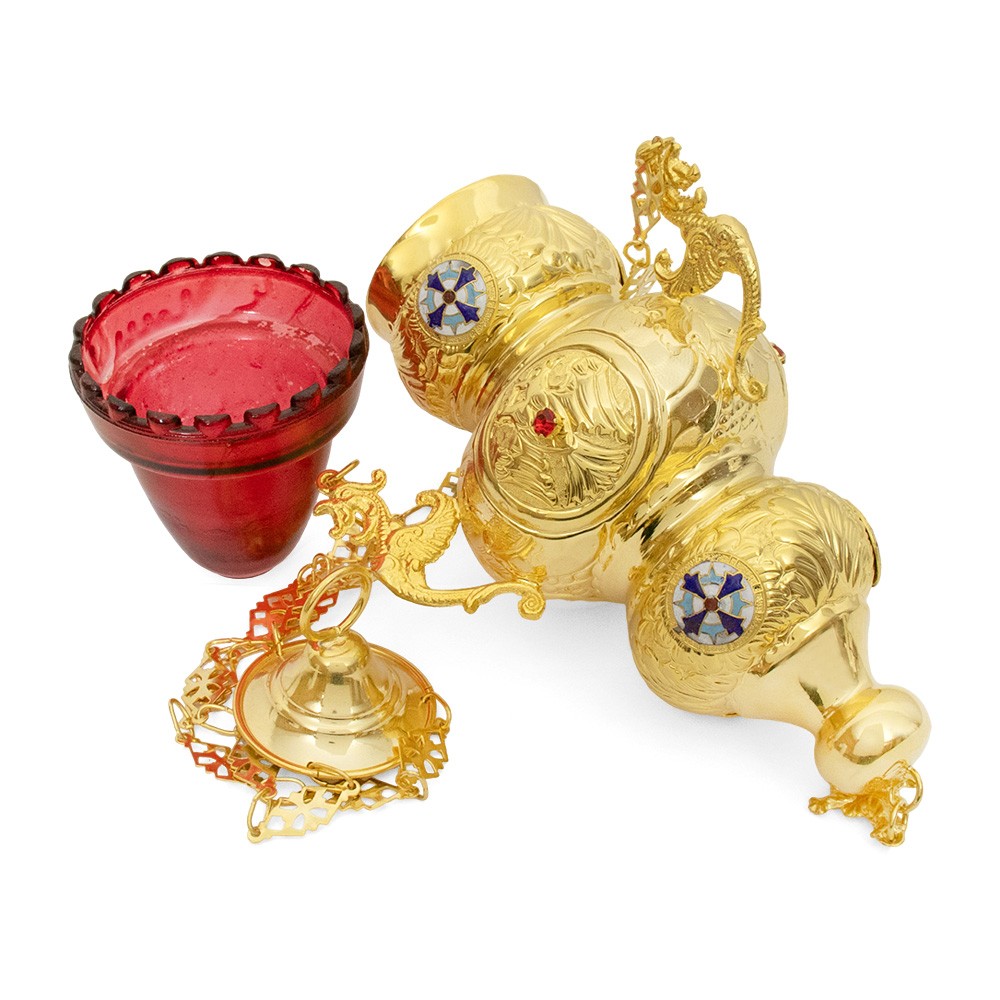 Lampada ortodossa per il Santissimo Sacramento, realizzata interamente in ottone con finitura dorata e arricchita con decori smaltati.