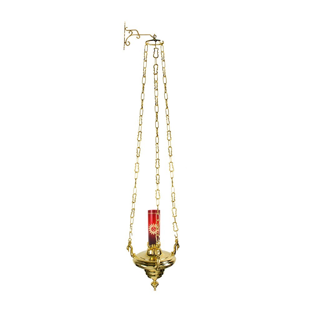 Lucerna in ottone dorata per il Santissimo Sacramento. Questo arredo sacro è utilizzabile a cera liquida. Completa di catene da circa 1 metro di lunghezza e braccio a sospensione. Realizzato interamente in ottone con rifinitura dorata. Su richiesta disponibile anche con attacco elettrico, per maggiori informazioni chiama il nostro servizio clienti +39 0882 335424 oppure scrivi a store@myriamartesacrastore.it