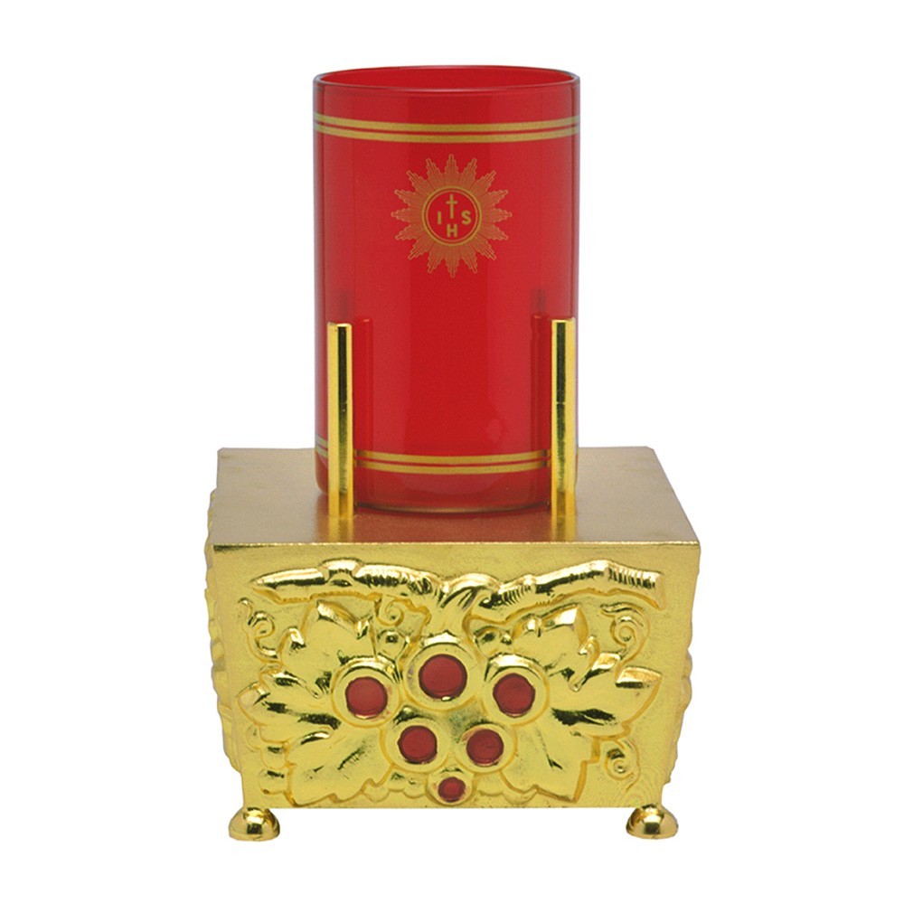 Questa lampada da altare è realizzata in bronzo con finitura dorata. E' finemente decorata con grappoli d'uva e smalto rosso. La lampada è alta 14 cm, adatta da utilizzare con il vetro diametro massimo di 8 cm. Prodotto di ottima fattura, produzione italiana.