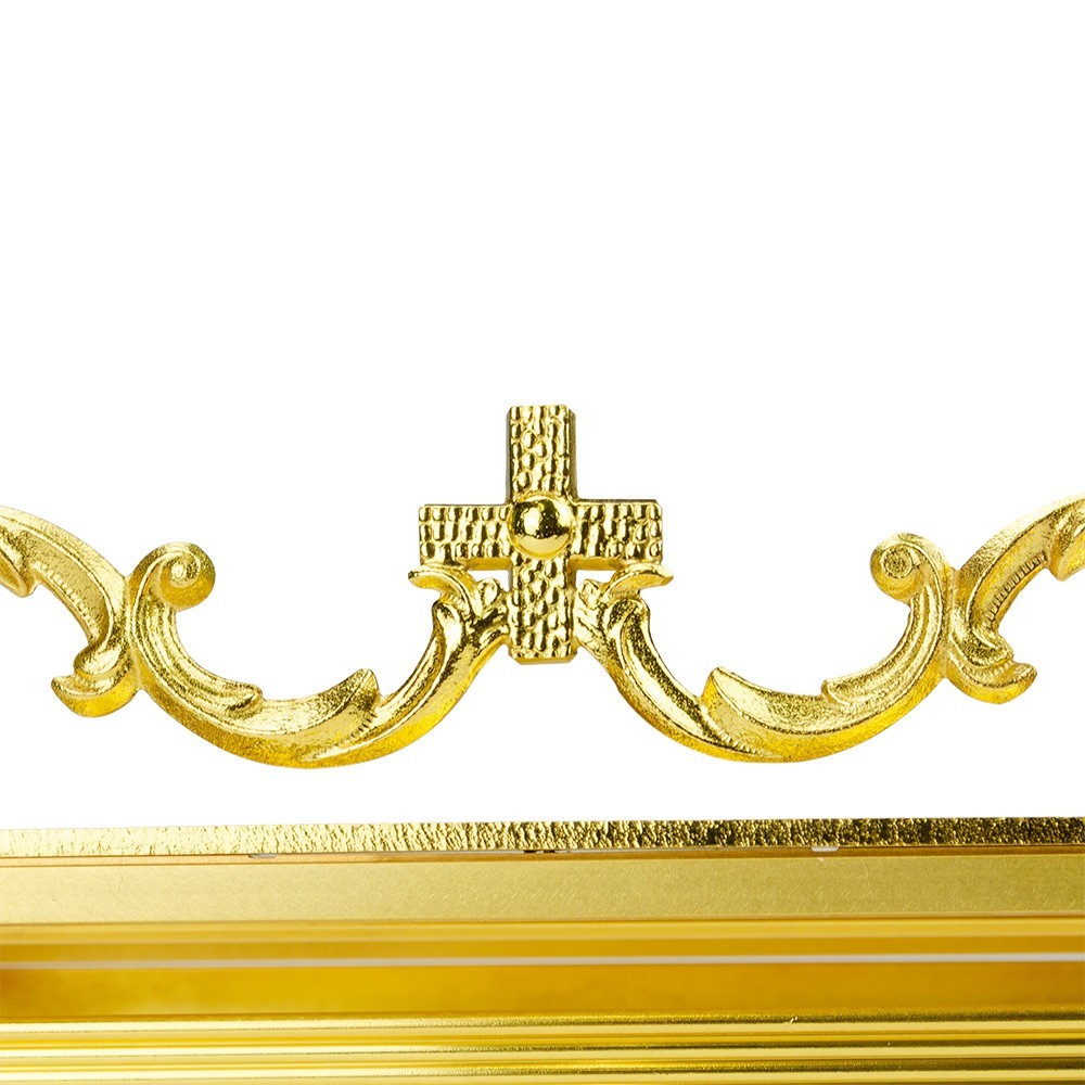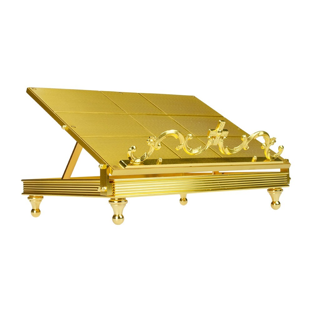 Leggio da mensa in ottone dorato con piano d'appoggio regolabile. Questo bellissimo arredo sacro è finemente decorato e misura 34x27 cm. Viene venduto completo di cuscino rosso.