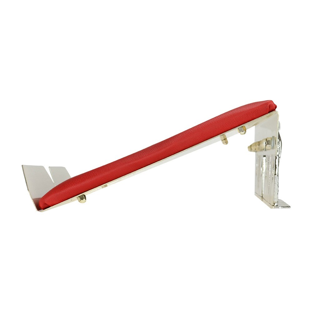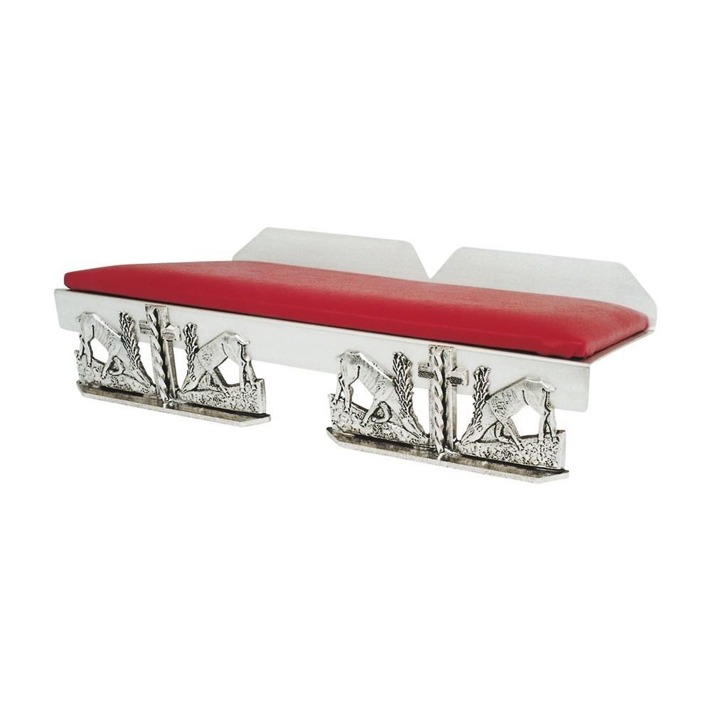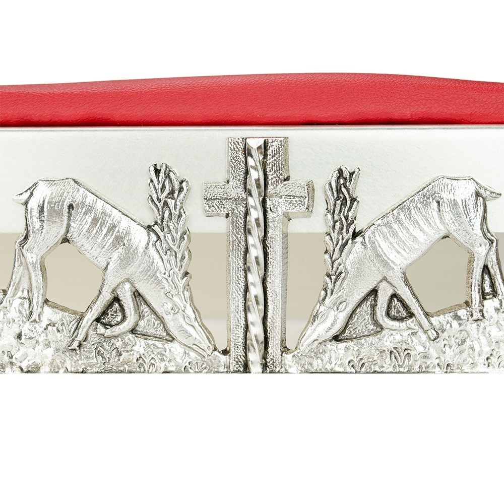 Leggio da tavolo, arredo sacro realizzato interamebte in ottone e decorato con la rappresentazione simbolica di cervi che bevono alla fonte. Questo leggio da chiesa è completo di un elegante cuscino rossso in semilpelle.