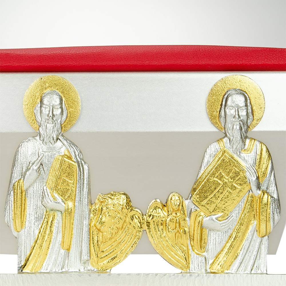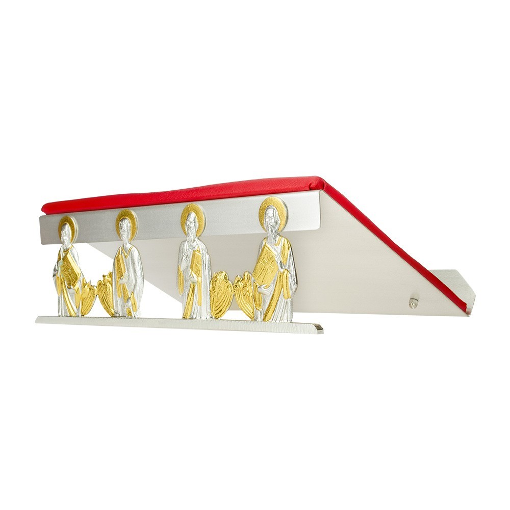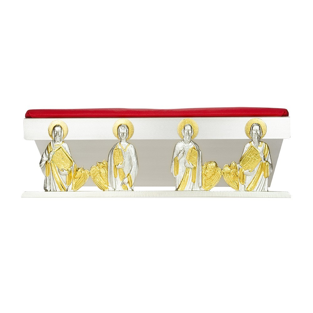 Leggio da chiesa con "Evangeisti". Arredo sacro realizzato in ottone bicolore e decorato con la rappresentazione dei quattro Evagelisti. Il leggio misura 38x25 cm ed è fornito di un elegante cuscino rosso in semilpelle.
