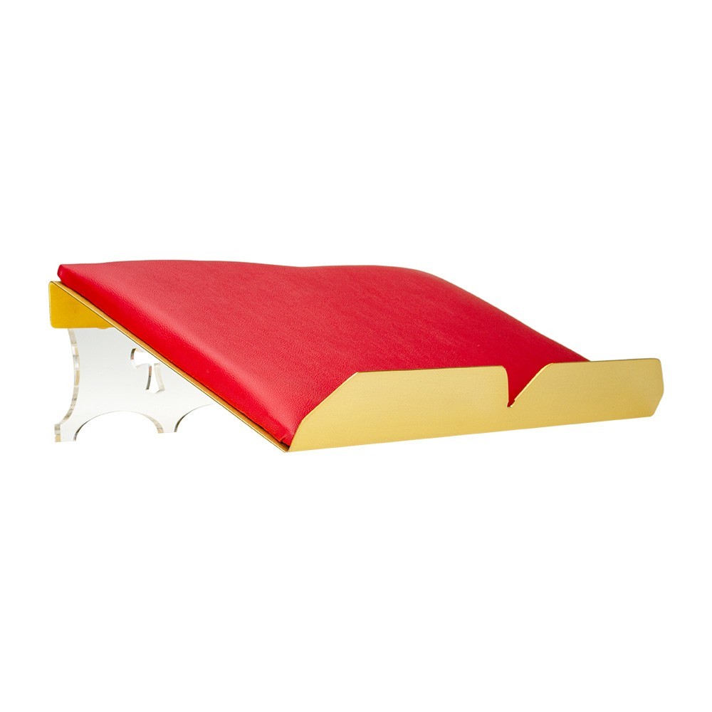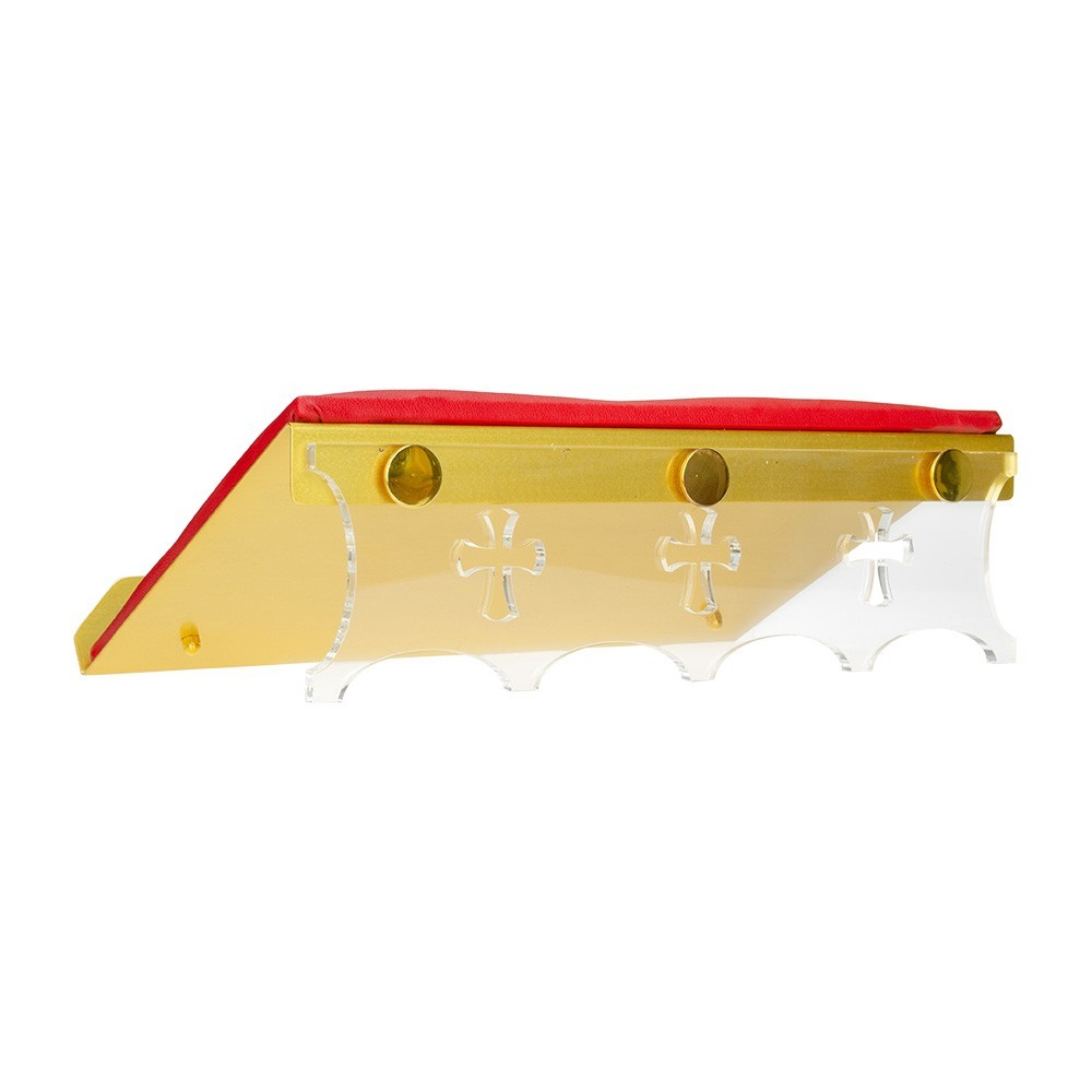 Leggio da chiesa in plexiglass e ottone. La parte anteriore di questo leggio è decorata con tre croci traforate. Questo leggio da mensa viene venduto completo di cuscino rosso in semilpelle.