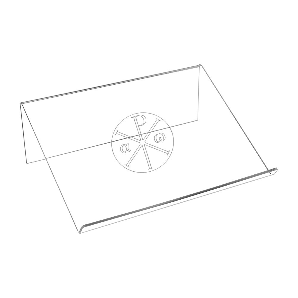 Le dimensini di questo leggio da tavolo sono 45x30x12,5 cm, si presenta interamente in plexiglass con immagine incisa a laser raffigurante i sinboli Alfa, Omega e croce PX.