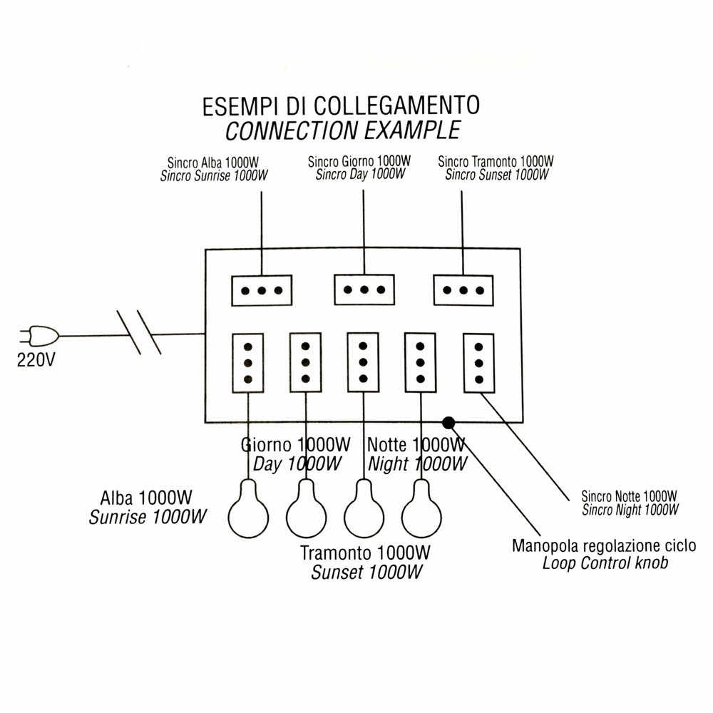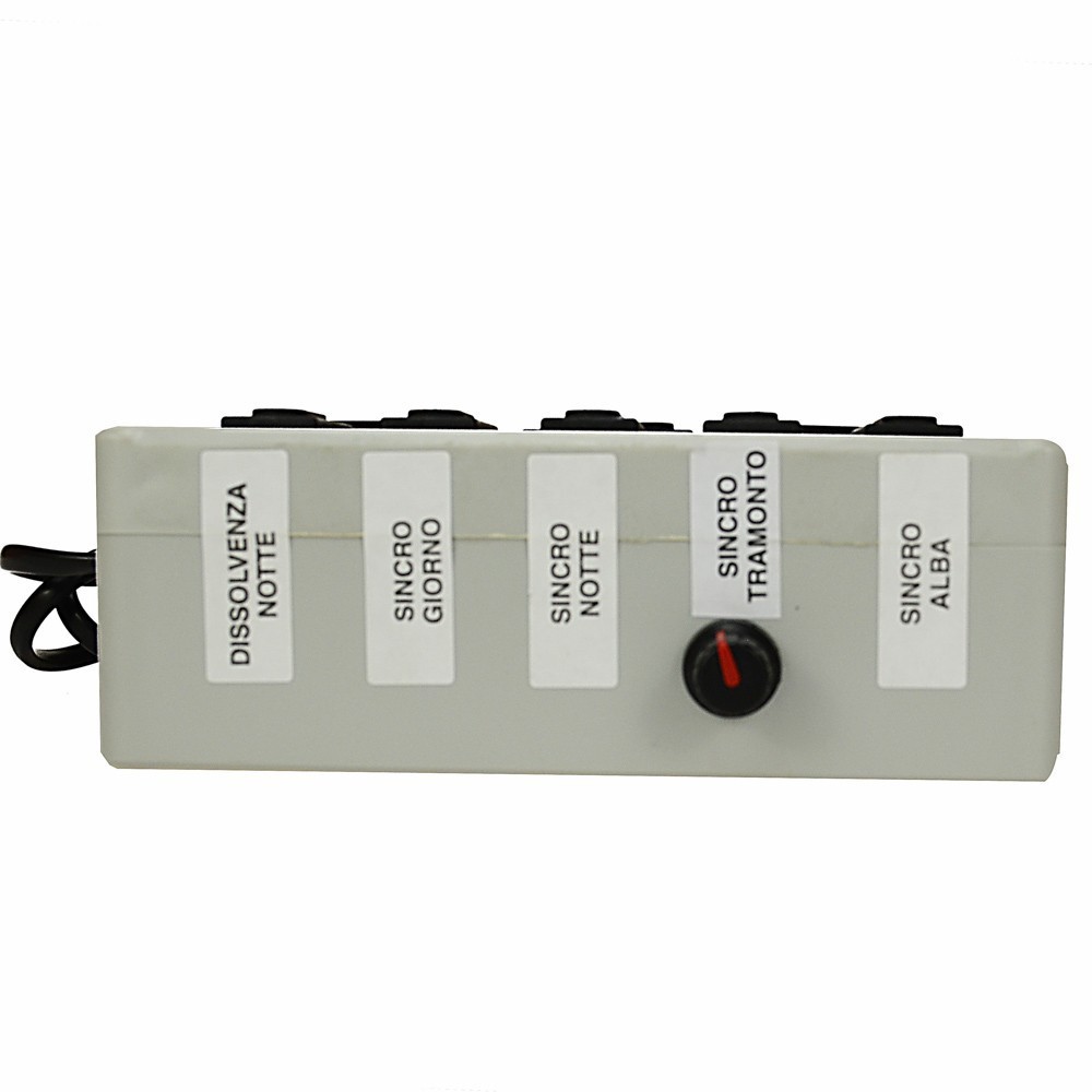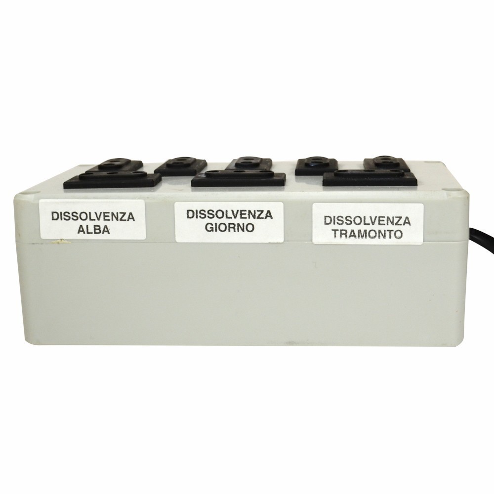 Nella presa DISS. ALBA vanno collegate tutte le lampade necessario per l'illuminazione dell'alba. Nella presa DISS. GIORNO vanno collegate tutte le lampade necessarie per l'illuminazione giorno. Nella presa DISS. TRAMONTO tutte le lampade del tramonto, nella presa DISS. NOTTE le lampade della notte. Nelle prese SINCRO ALBA, SINCRO GIORNO, SINCRO TRAMONTO e SINCRO NOTTE tutti gli effetti relativi all'alba, giorno, tramonto e notte.