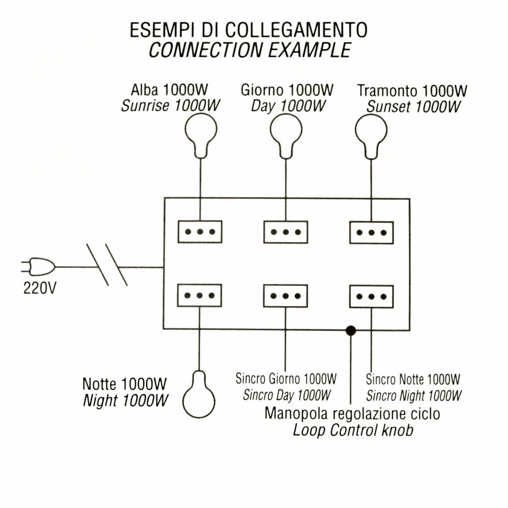 Nella presa DISS. ALBA vanno collegate tutte le lampade necessarie per l'illuminazione dell'alba. Nella presa DISS. GIORNO vanno collegate tutte le lampade necessarie per l'illuminazione giorno. Nella presa DISS TRAMONTO tutte le lampade del tramonto. Nella presa DISS. NOTTE tutte le lampade della notte. Nella SINCRO GIORNO e SINCRO NOTTE tutti gli effetti relativi al giorno e alla notte.