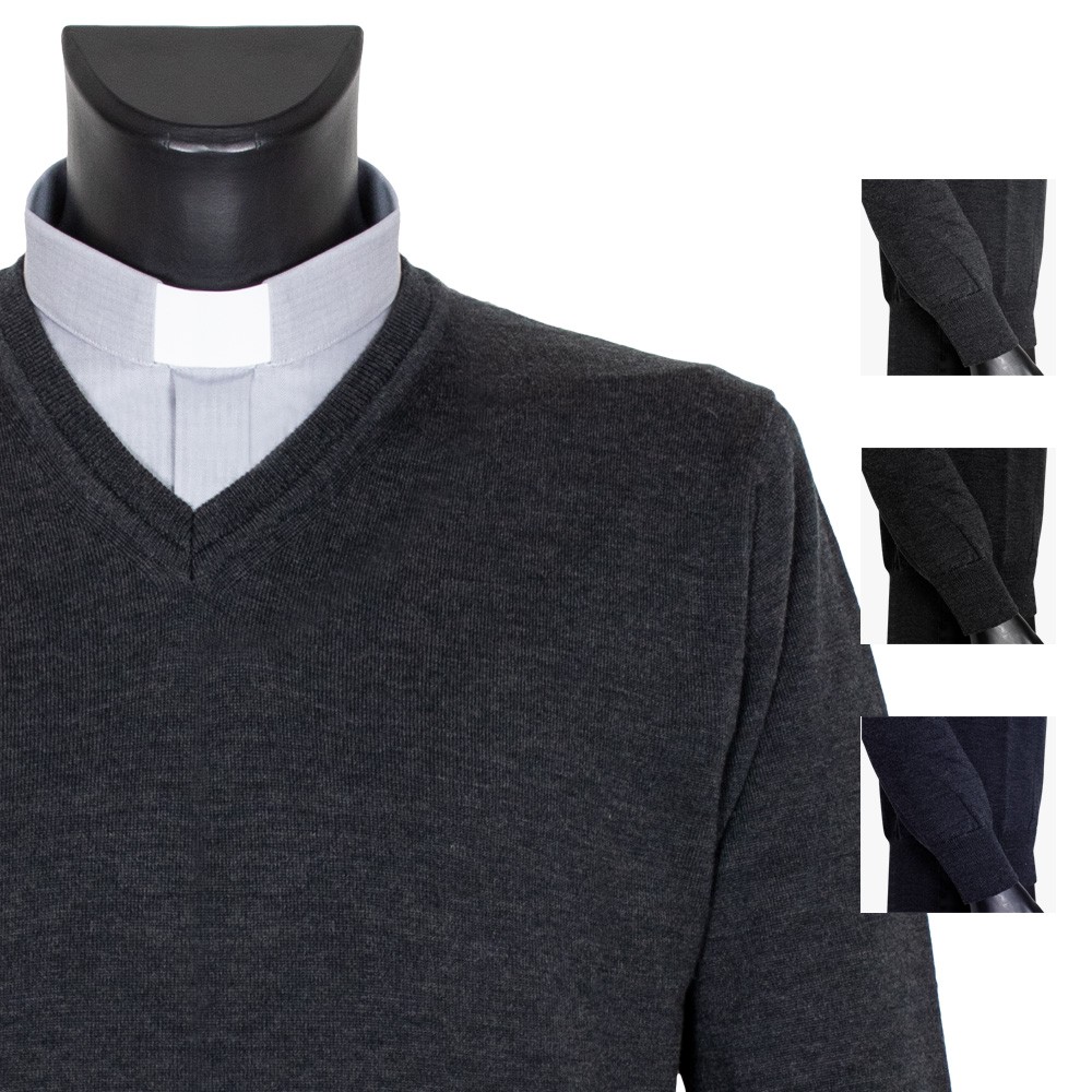 Pullover sacerdotate collo a V in 100% lana, disponibile nero, blu e grigio scuro.