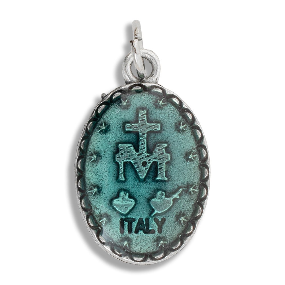 Medaglietta della Madonna Miracolosa, alta 2 cm, realizzata in metallo argento e smaltata blu su entrambi i lati.