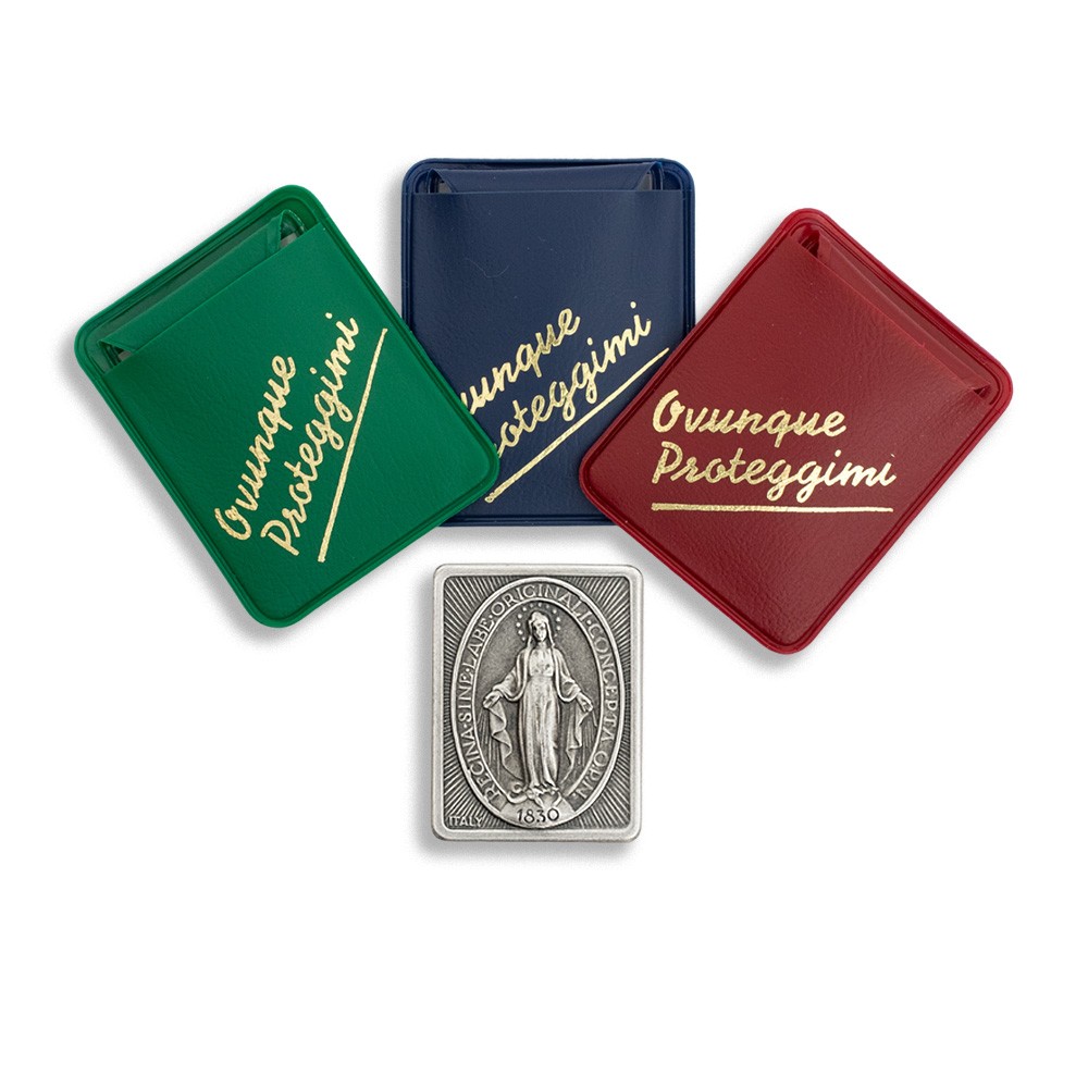 La medaglietta misura di diametro 2,5 cm ed è completa di custodia in plastica colorata in vari colori assortiti con scritta in oro "Ovunque proteggimi".
