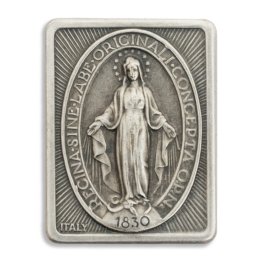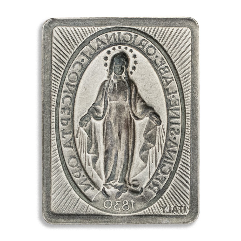 Targhetta con immagine in rilievo della Madonna Miracolosa realizzata in metallo tono argento.