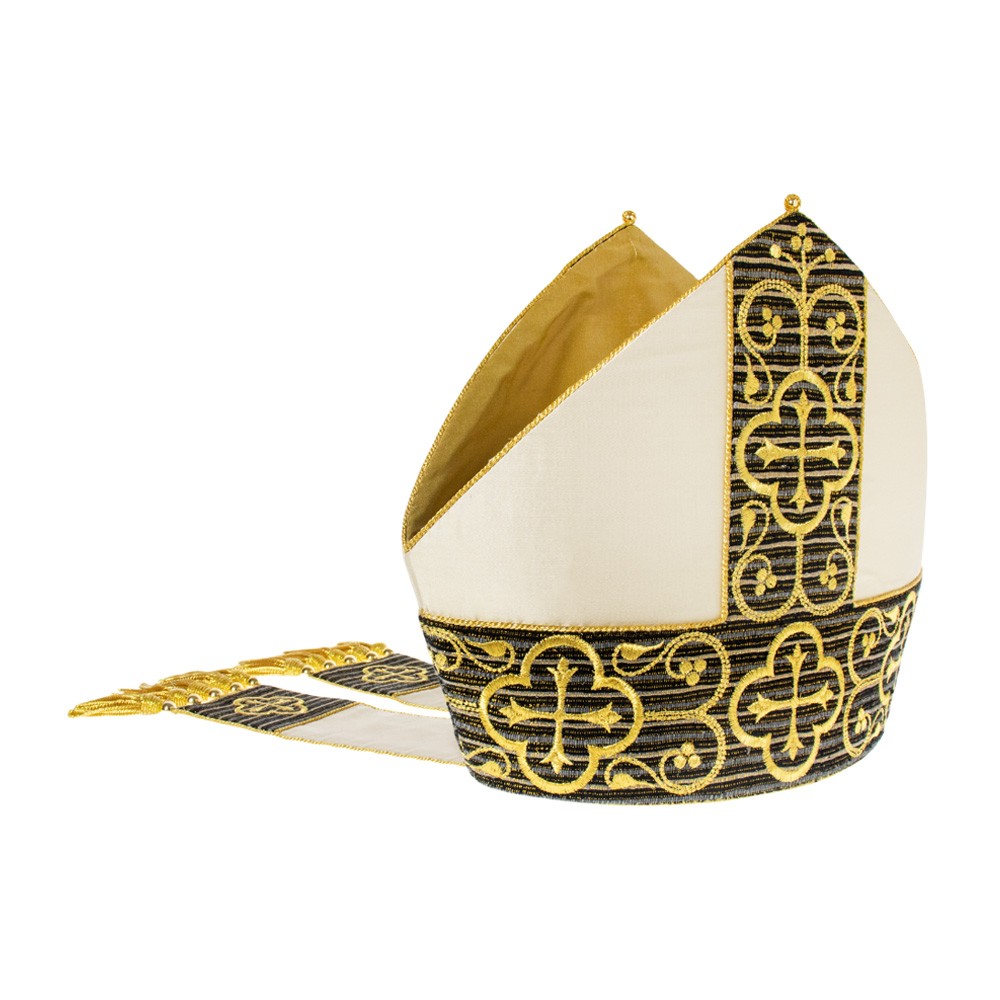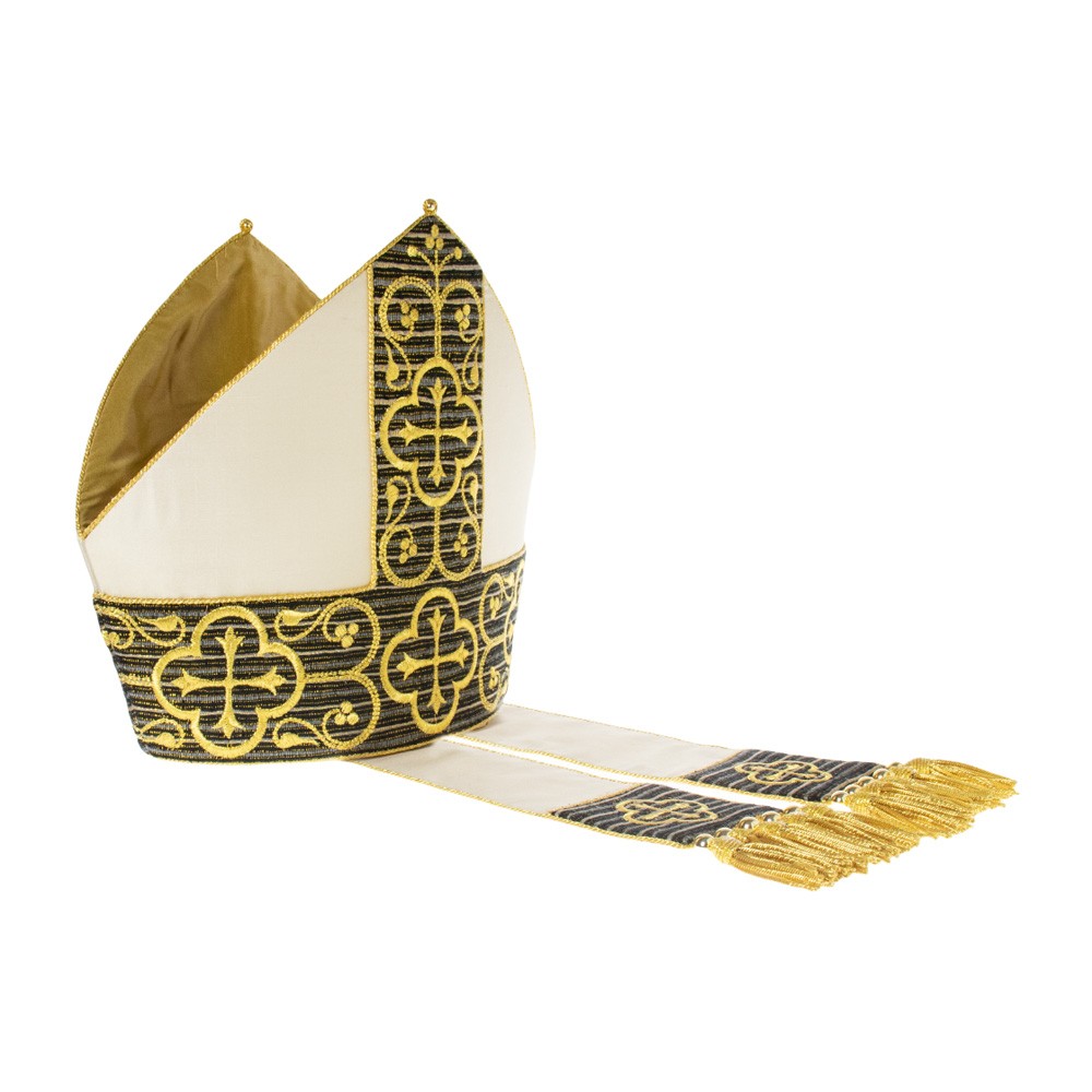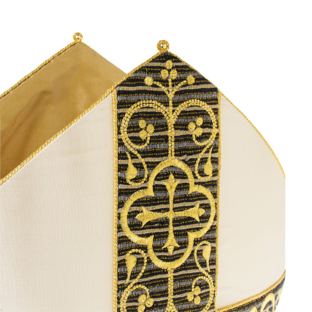 Mitria avorio con ricami in oro e frangia in canuttiglia oro sotto le infule. Prodotto di altissima qualità sartoriale, 100% Made in Italy.