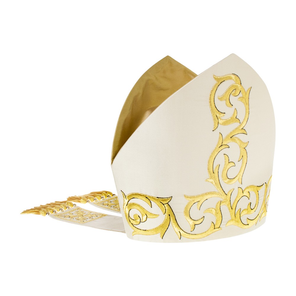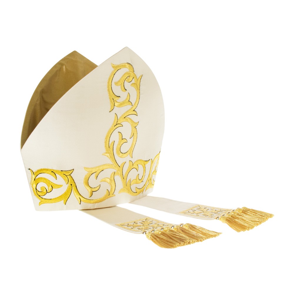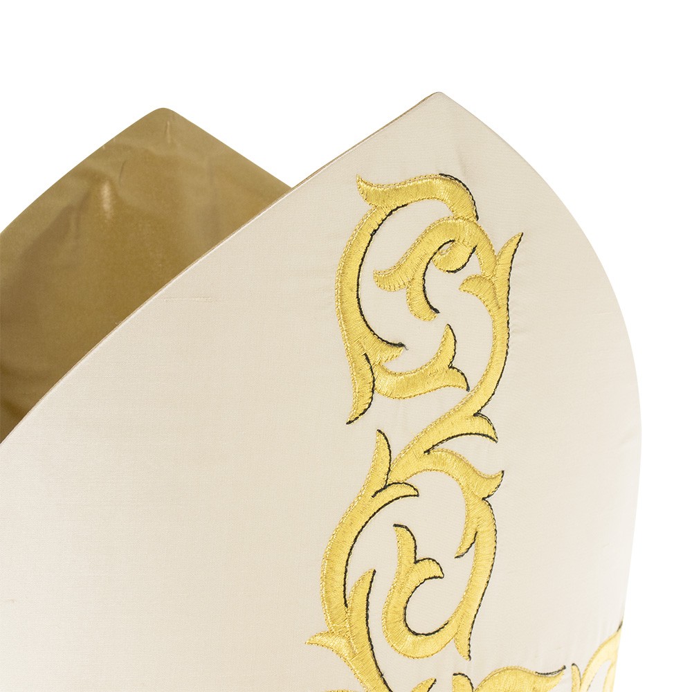 Mitria del vescovo confezionata in pregiato tessuto pura seta. Ricamata a macchina con filati dorati e arricchita con frangia oro.