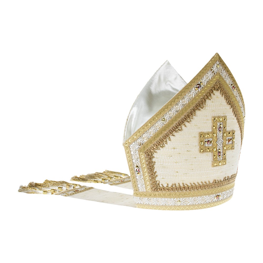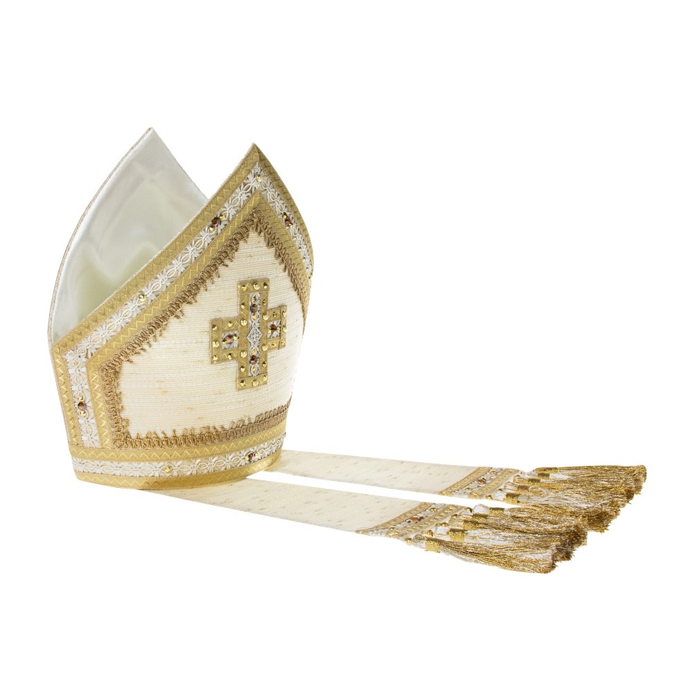 Mitria avorio con ricami in oro e frangia in canuttiglia oro sotto le infule. Prodotto di altissima qualità sartoriale, 100% Made in Italy.
