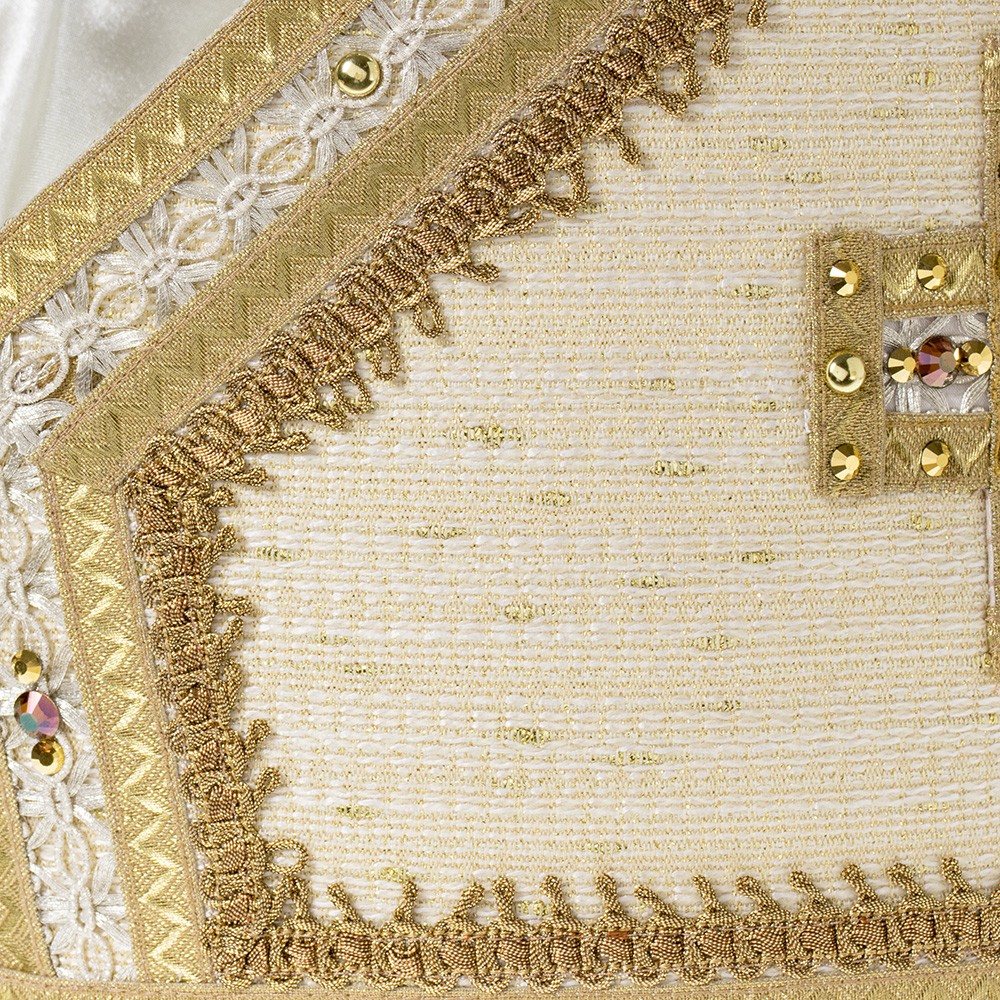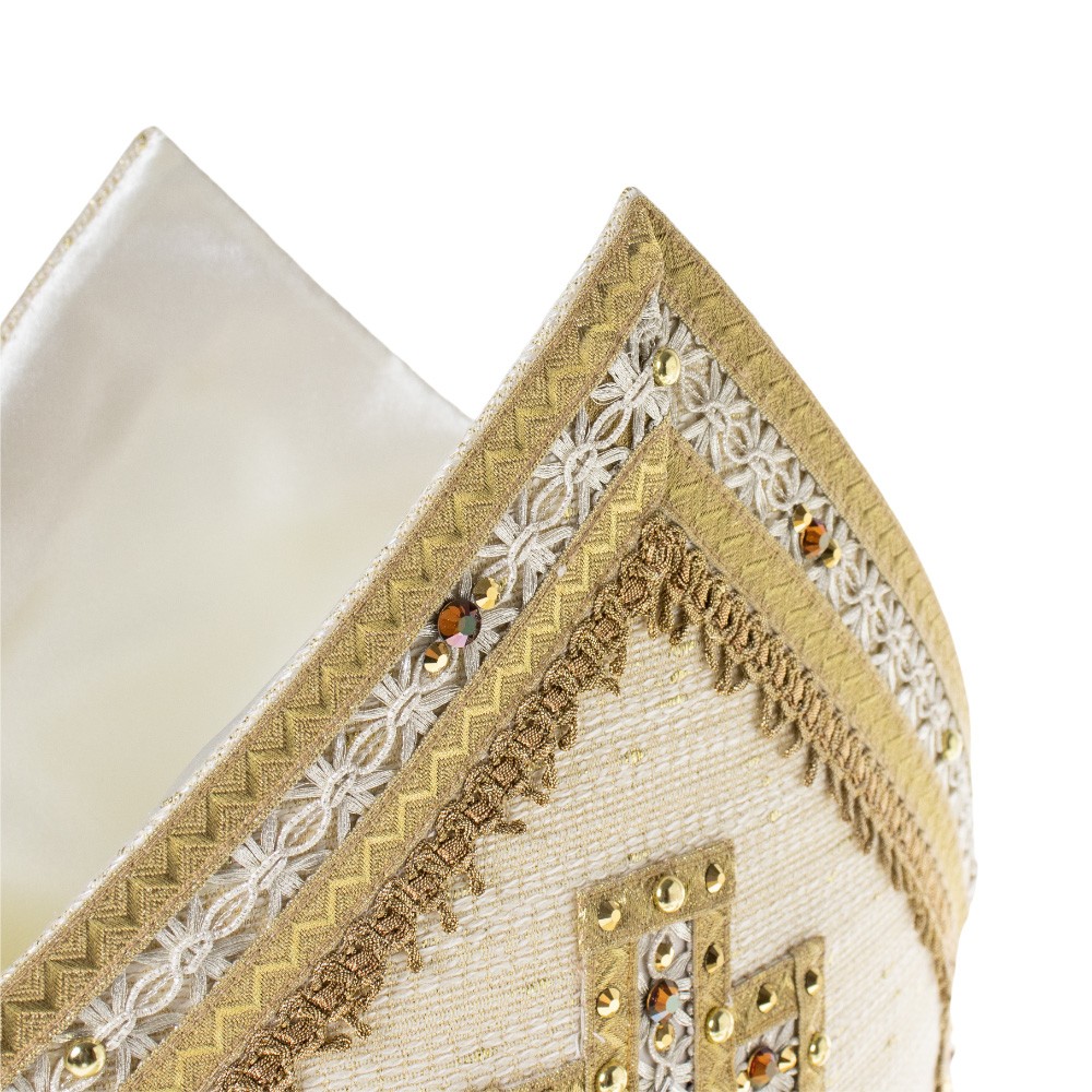 Questa preziosa mitria liturgica è disponibile in taglia 57.5 cm.