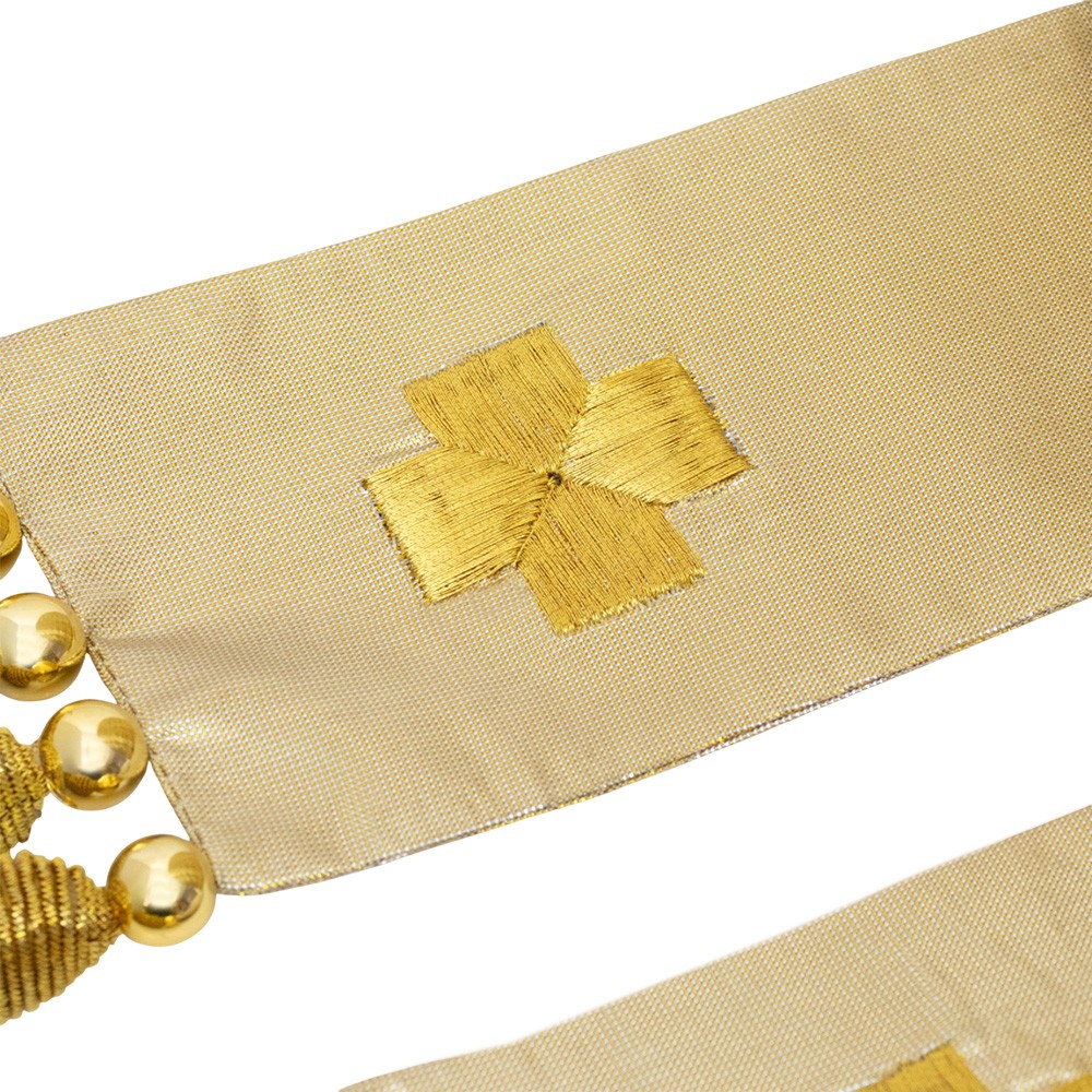- Frangia in canuttiglia oro: Cucita sotto le infule, dona un tocco di raffinatezza al design.
