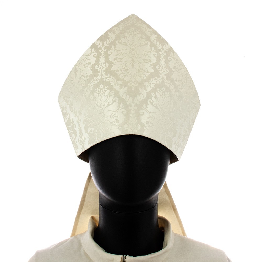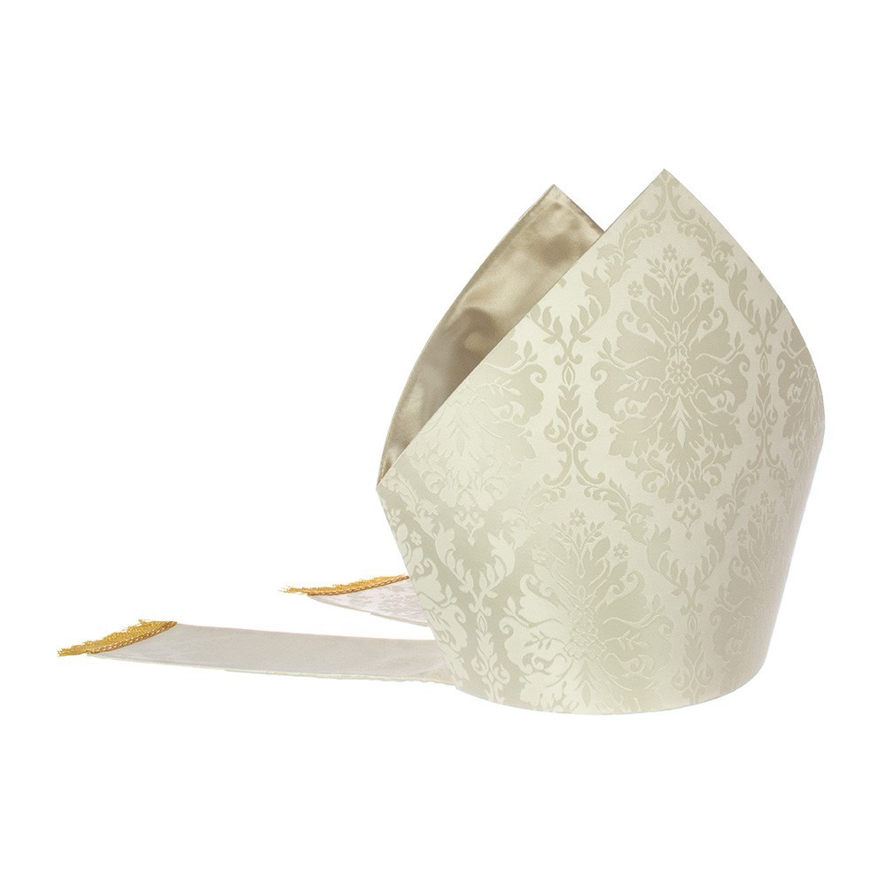 Mitria per vescovo color avorio in damasco 100% acetato. Completa di frangia color oro. Altezza 27 cm. Viene fornita di custodia e scatola.