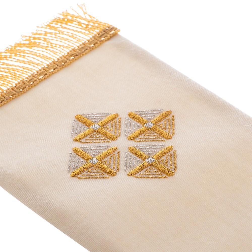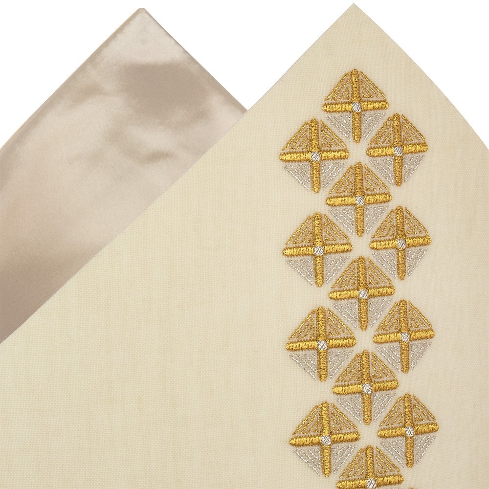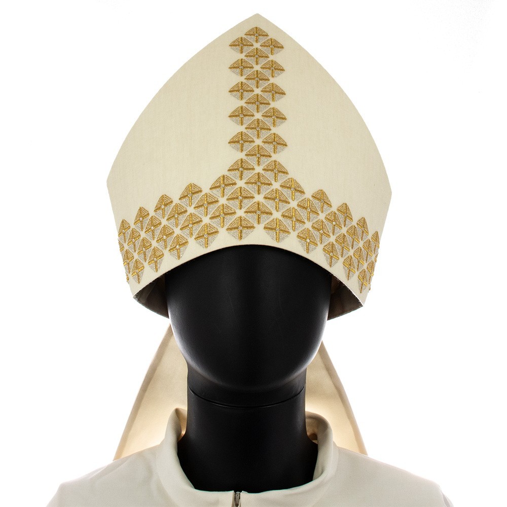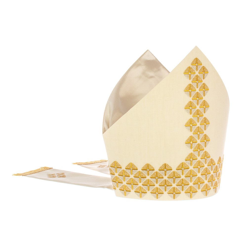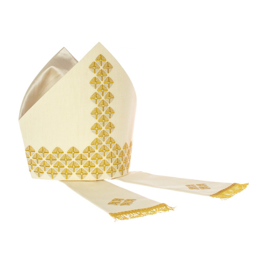 Mitria in tessuto pura lana color avorio. Ricamata a macchina con ricami a forma di piccole croci di colore oro e avorio. Questa mitria liturgica è disponibile nei vari colori liturgici e realizzabile in tutte le taglie. Confezionata in elegante custodia in tessuto imbottito. Made in Italy.