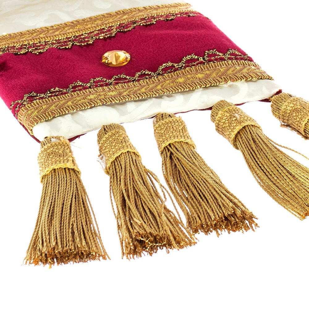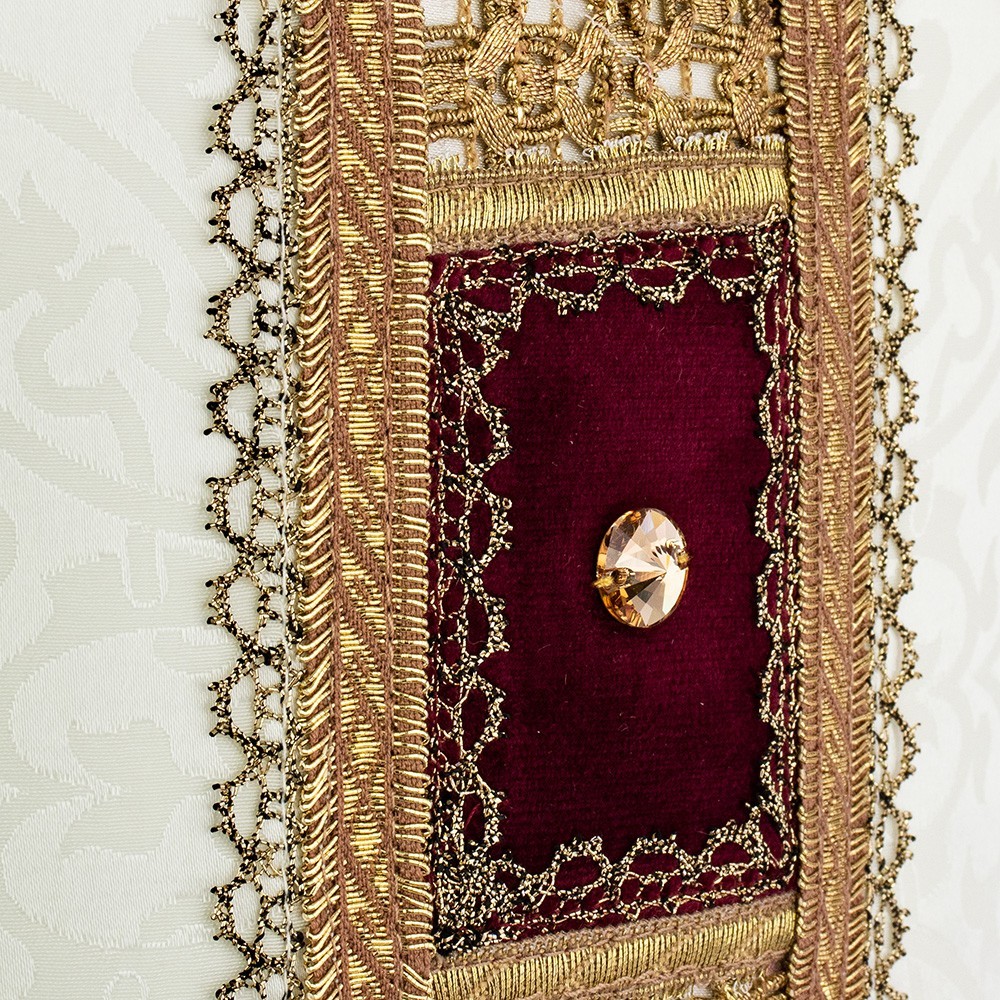 Mitria color avorio con applicazioni nastri e pietre. Questo elegante paramento vescovile è in tessuto misto 68% acetato e 36% viscosa, decorato con frange e pietre color oro. Disponibile nei quattro colori liturgici e realizzabile in tutte le taglie. Confezionata in elegante custodia in tessuto imbottito. Produzione 100% italiano.