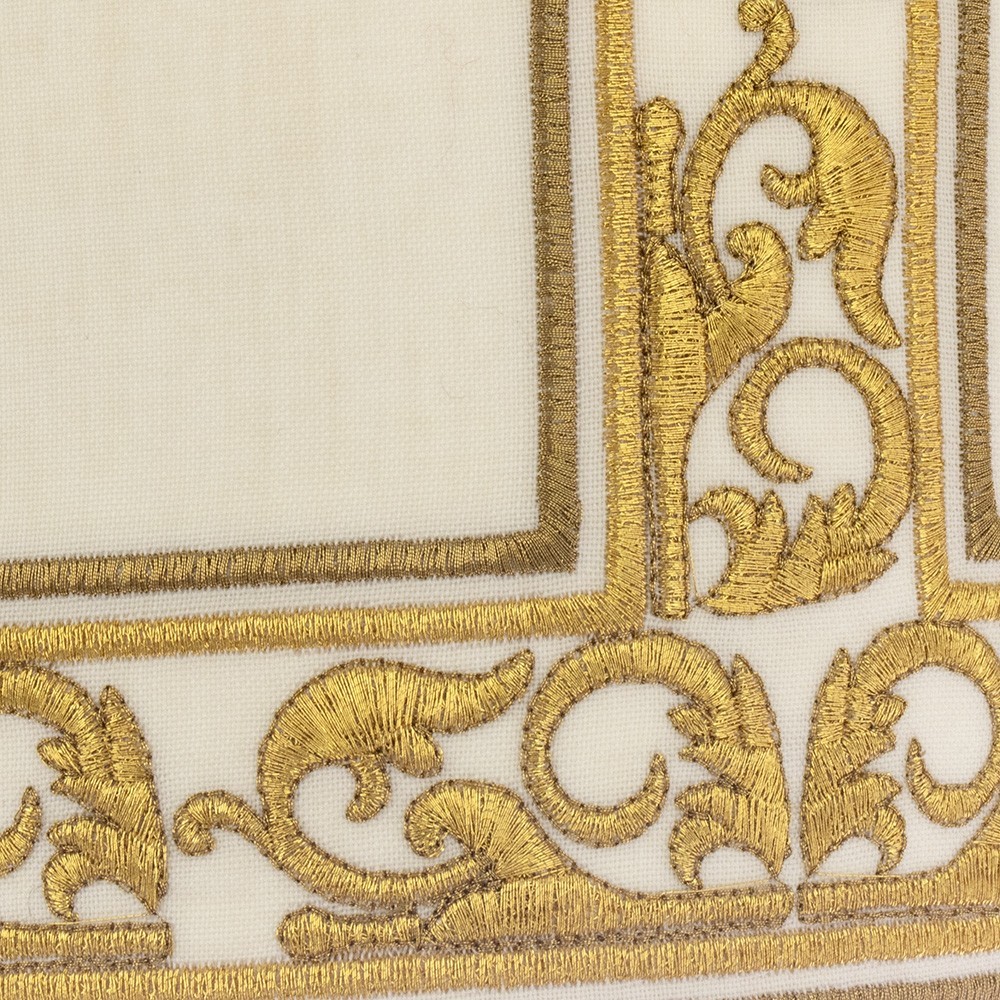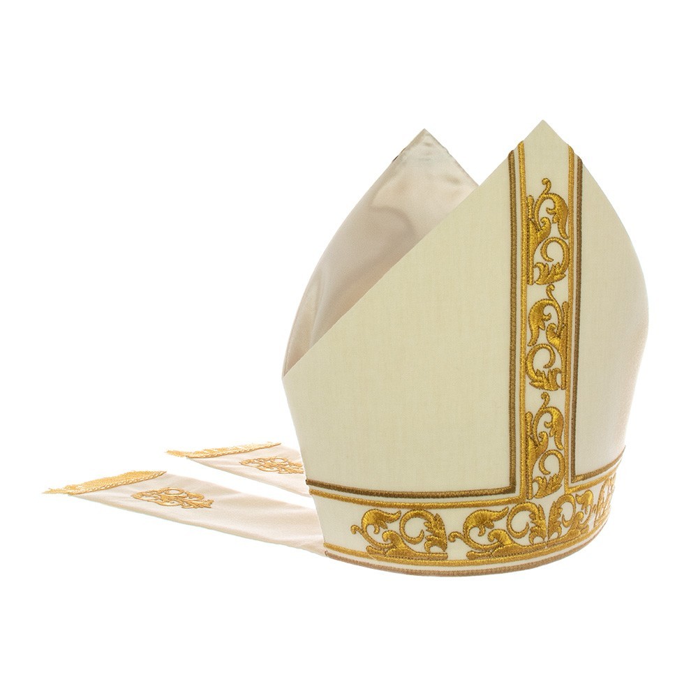 Mitria del vescovo color avorio in tessuto pura lana 100% foderata. Realizzata con ricco ricamo a macchina color oro. Completa di frangia. Altezza 27 cm. Viene fornita di custodia in tessuto bianco e scatola.