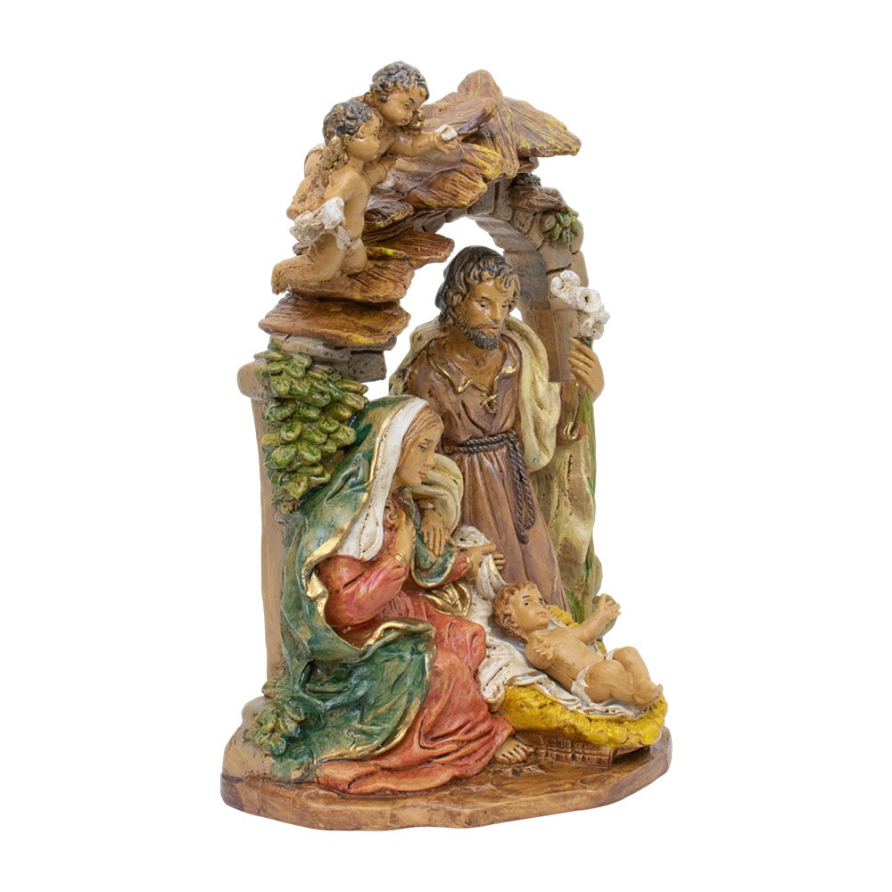 Questa graziosa natività è realizzata interamente in PVC colorazione tipo legno, composta da un unico blocco San Giuseppe, Madonna in ginocchio, Gesù Bambino e 2 angioletti.