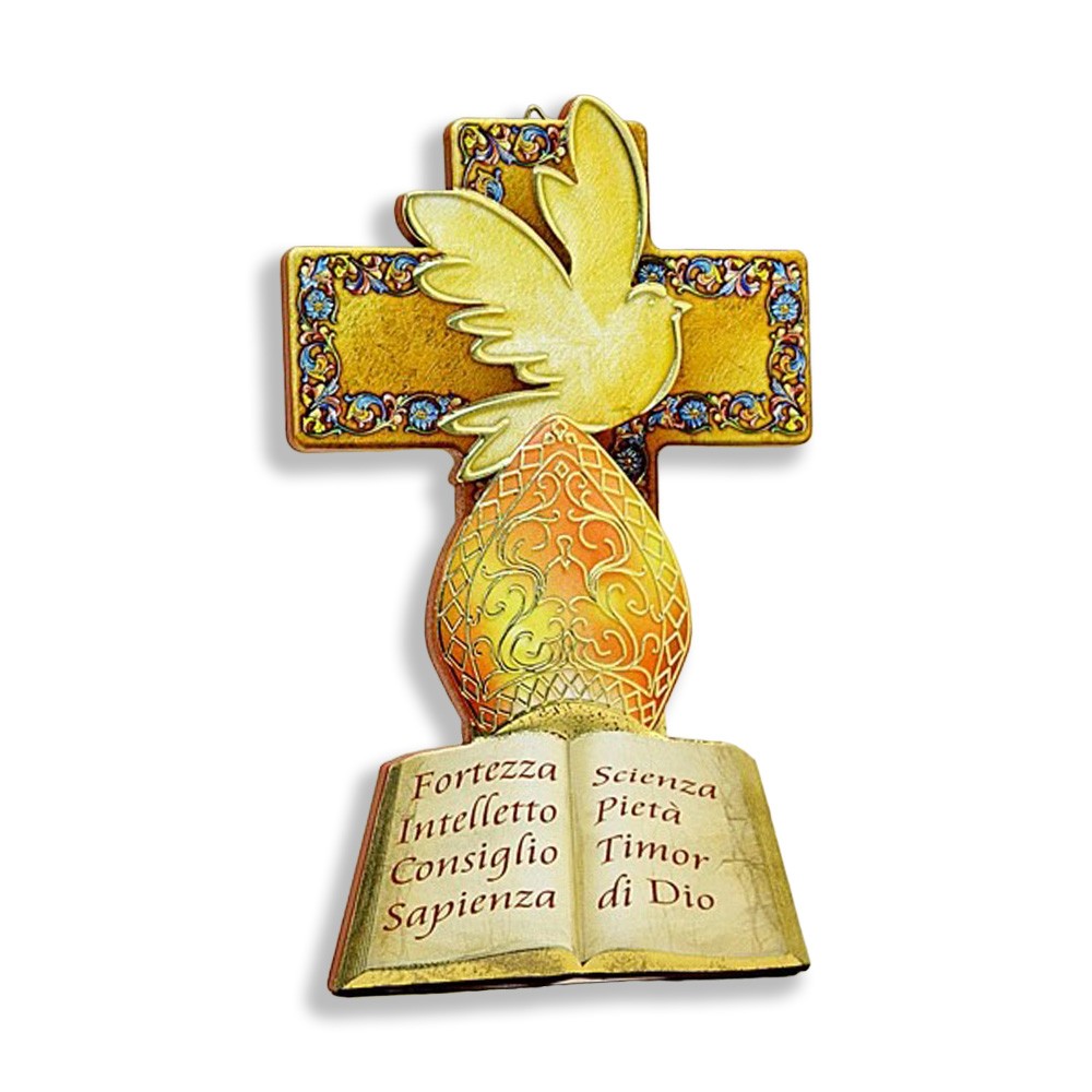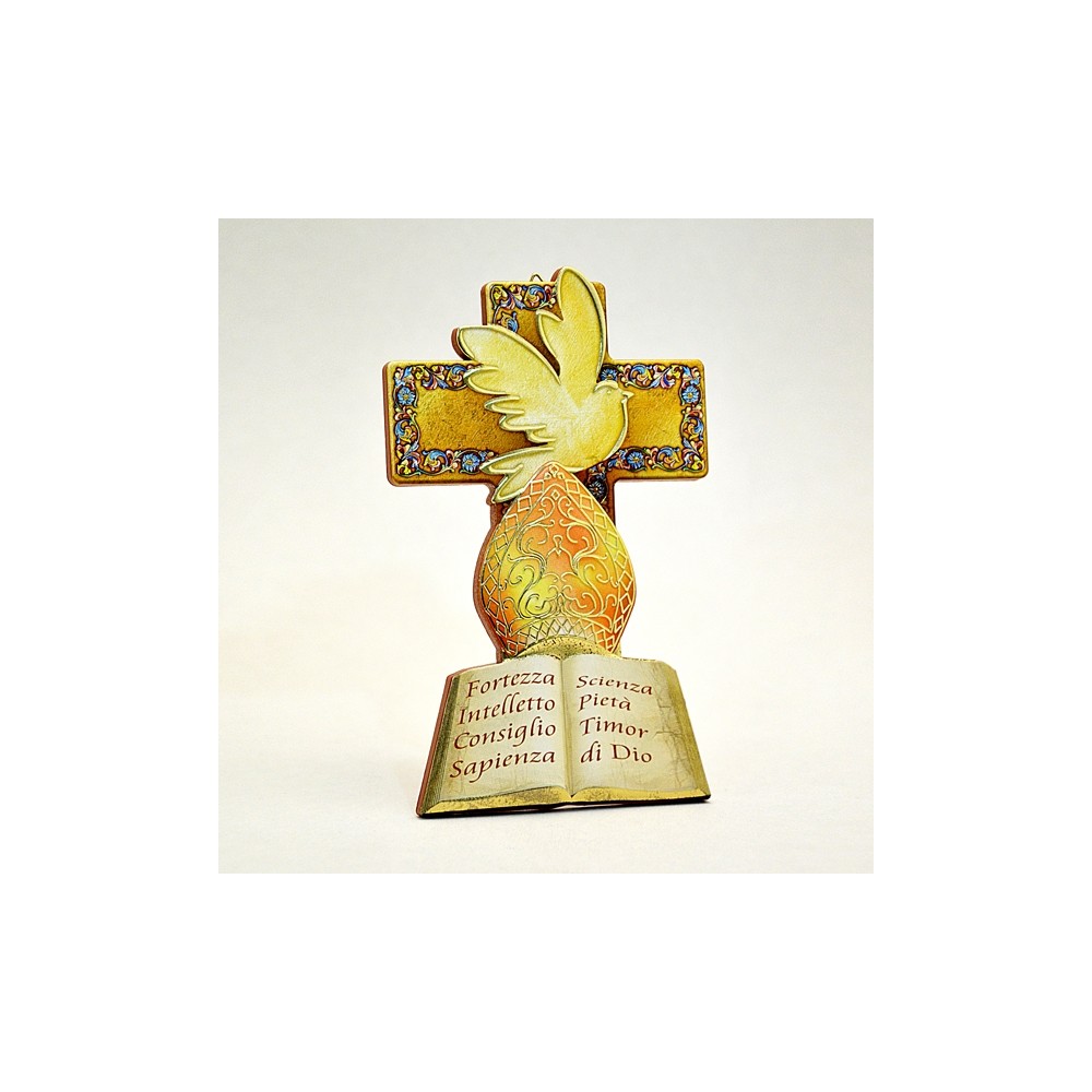 Croce Cresima piedino in plastica raffigurante la Colomba (Spirito Santo) e i sette Doni. Ottima idea regalo per il sacramento della Confermazione.-Cresima.