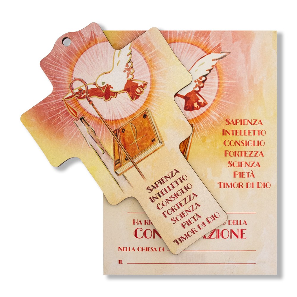 Il diploma formato 15x10,5 cm è ricordo che attesta il ricevimento della Cresima. Sul cartoncino vi è la stessa immagine riportata sulla croce dove è possibile scrivere il luogo, la data e il nome del bambino. Il tutto confezionato in una bustina trasparente.