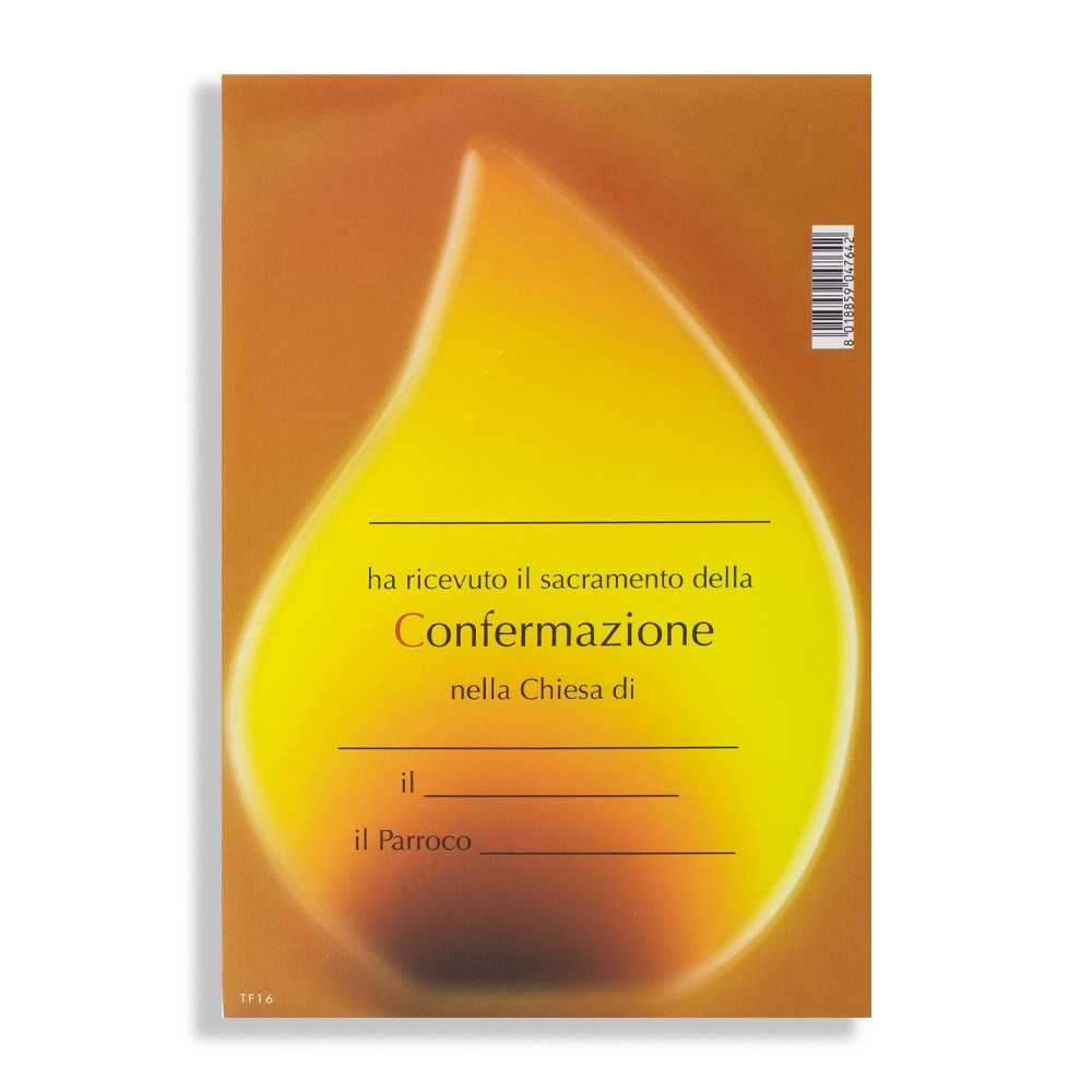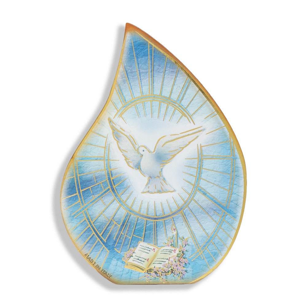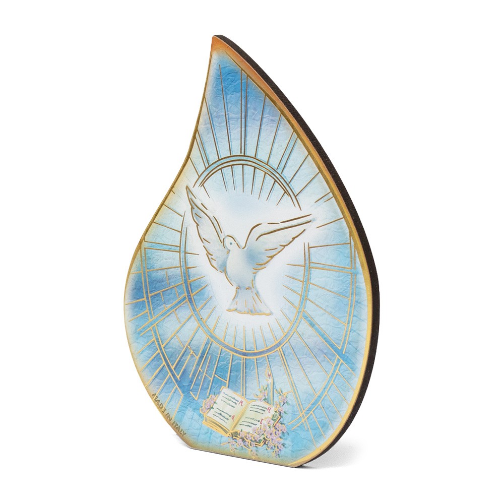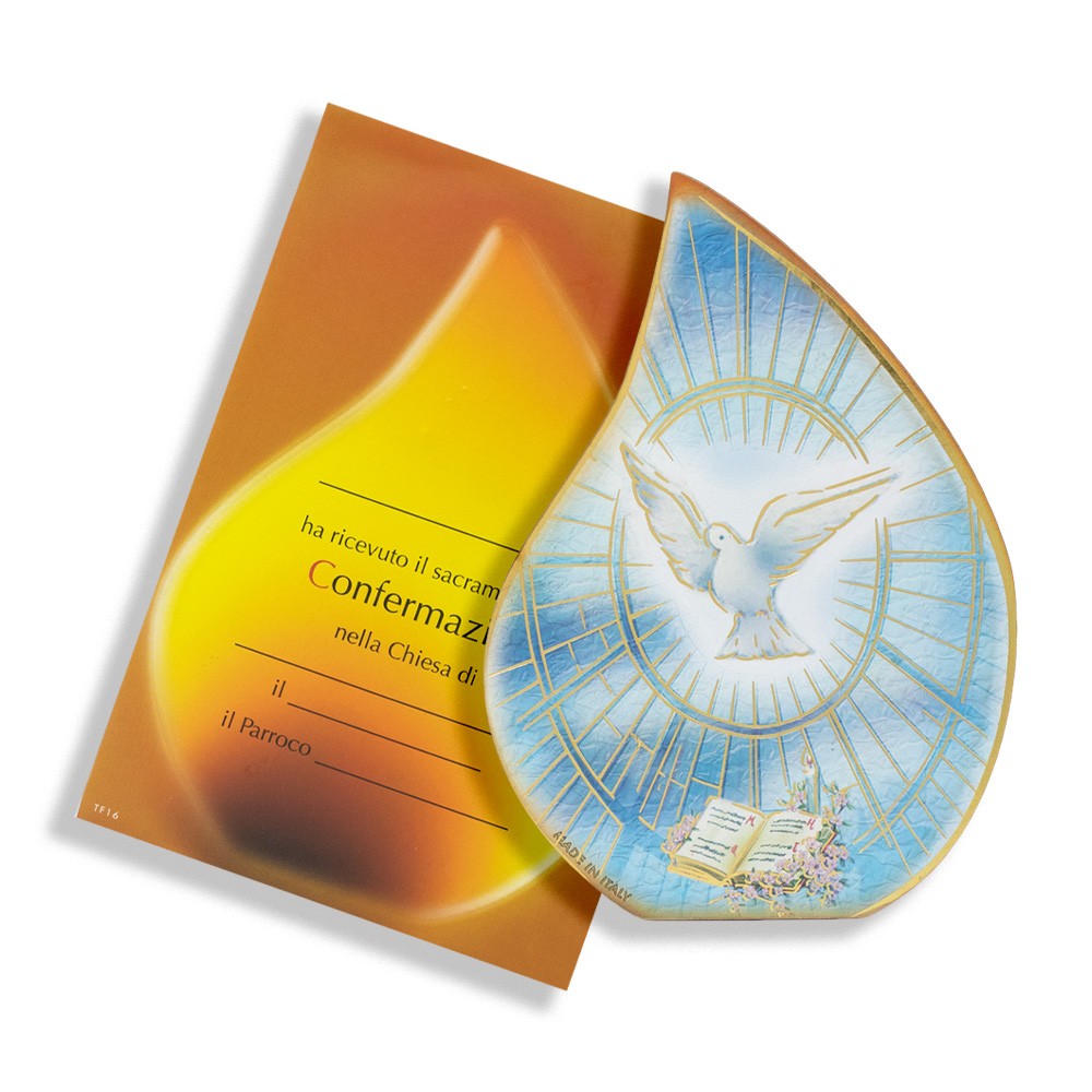 Il quadretto è a forma di fiamma interamente in legno MDF, corredato di piedino d'appoggio in metallo e cartoncino pergamena in ricordo del Santa Cresima.