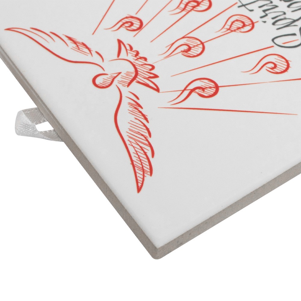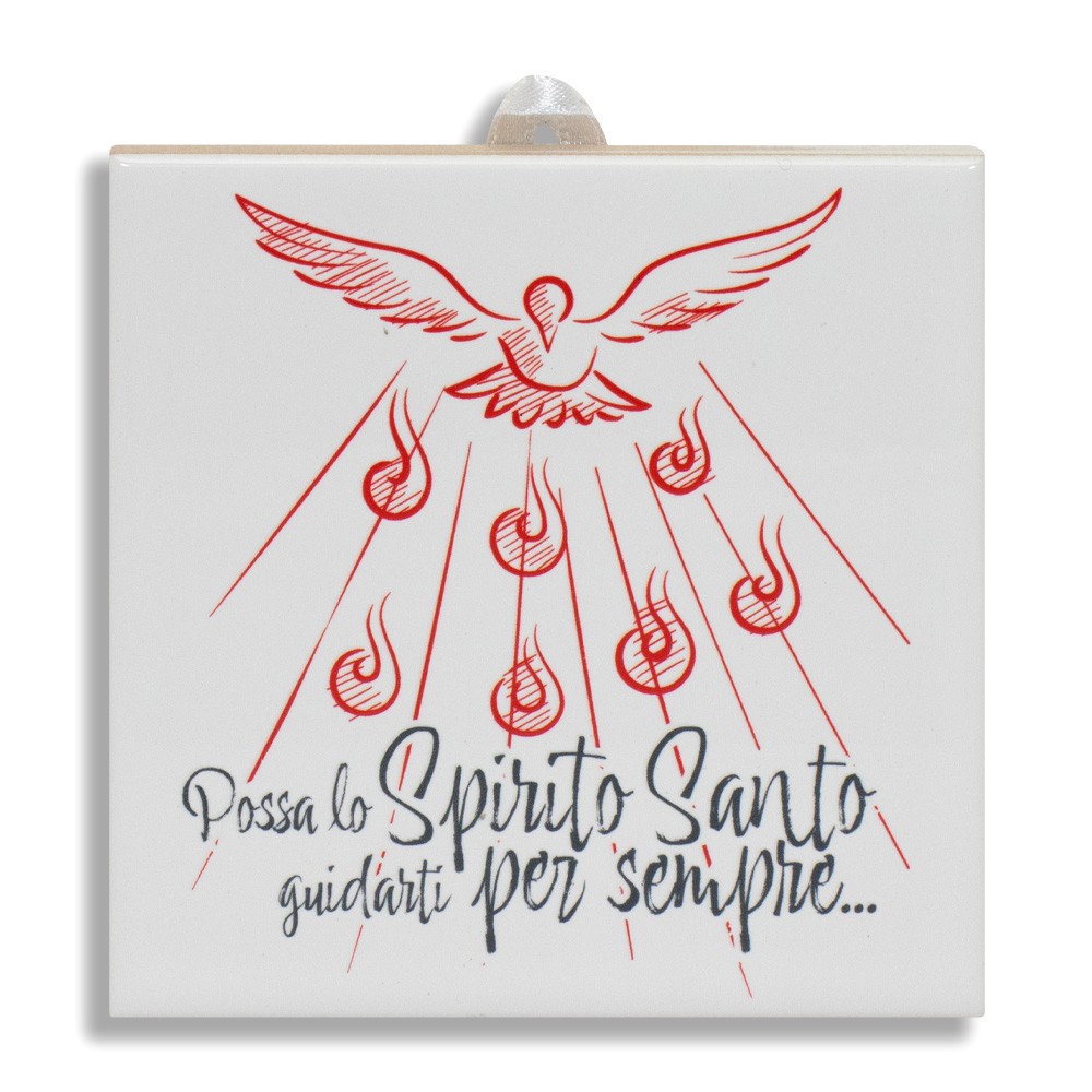 La piastrella si presenta su fondo bianco con decori stampati che raffigurano una colomba (Spirito Santo) con 7 fiamme .