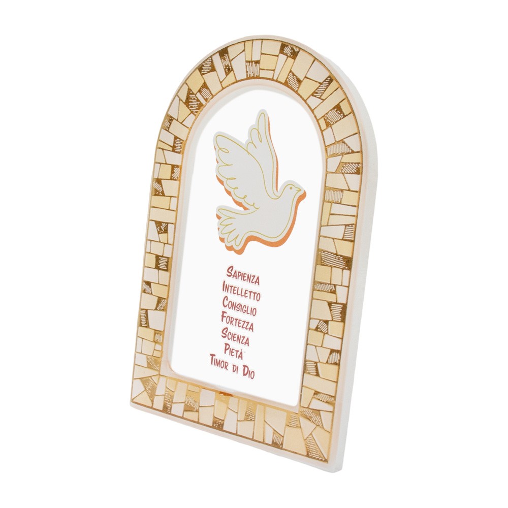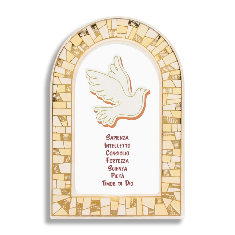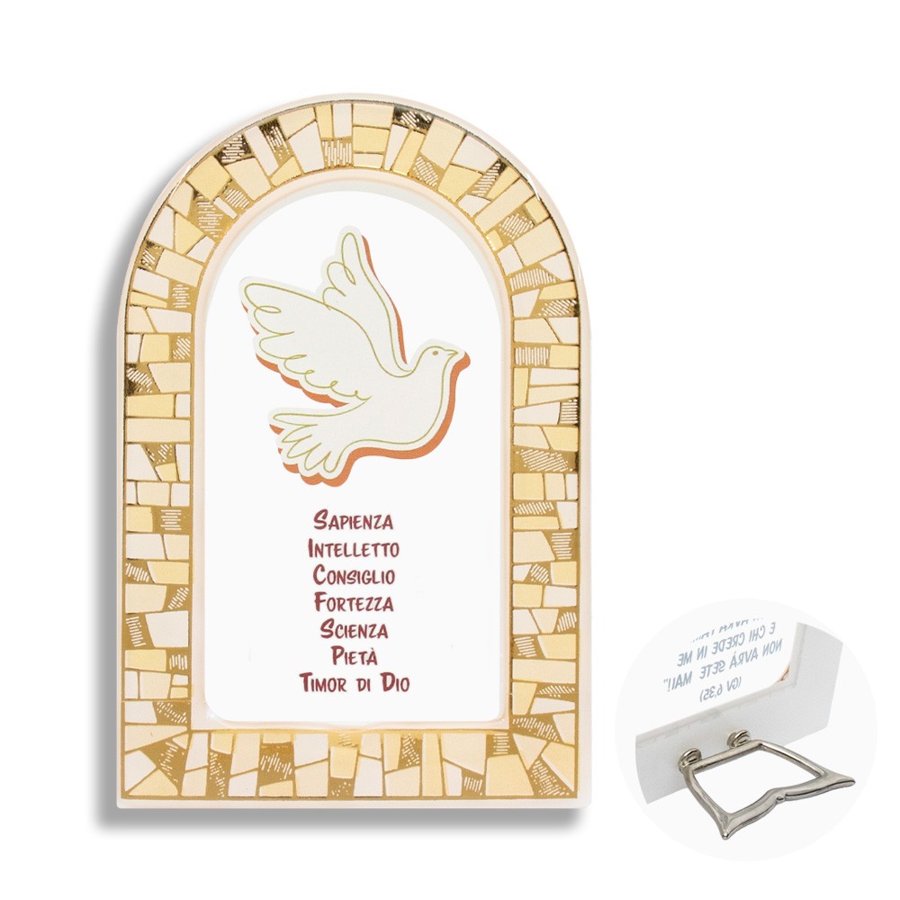 Sul quadretto è raffigurato lo Spirito Santo e i suoi 7 doni. Dotato di piedino in metallo argento per poterlo appoggiare.