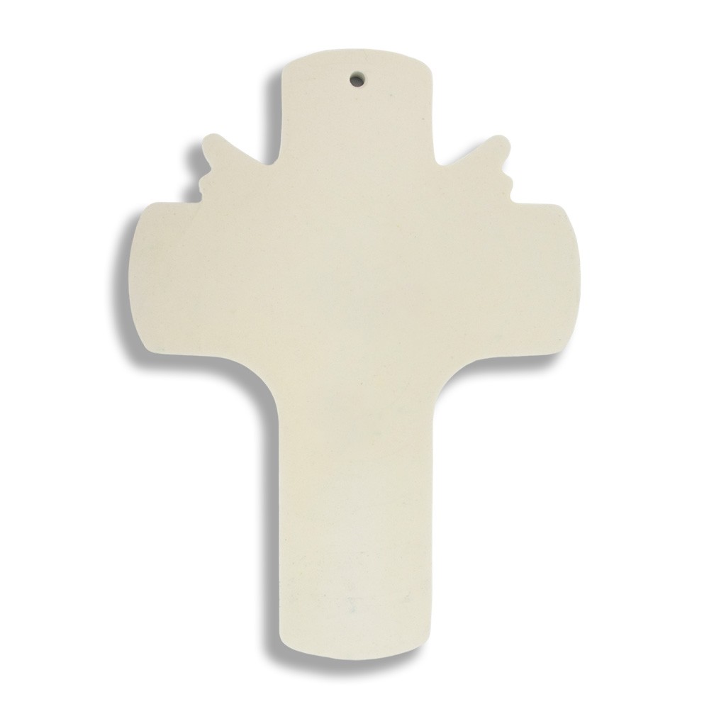 La croce misura 12x8,5 cm è in resina porcellana, resa importante da dettagli che la caratterizzano quali le tonalità di colore e i decori in rilievo.