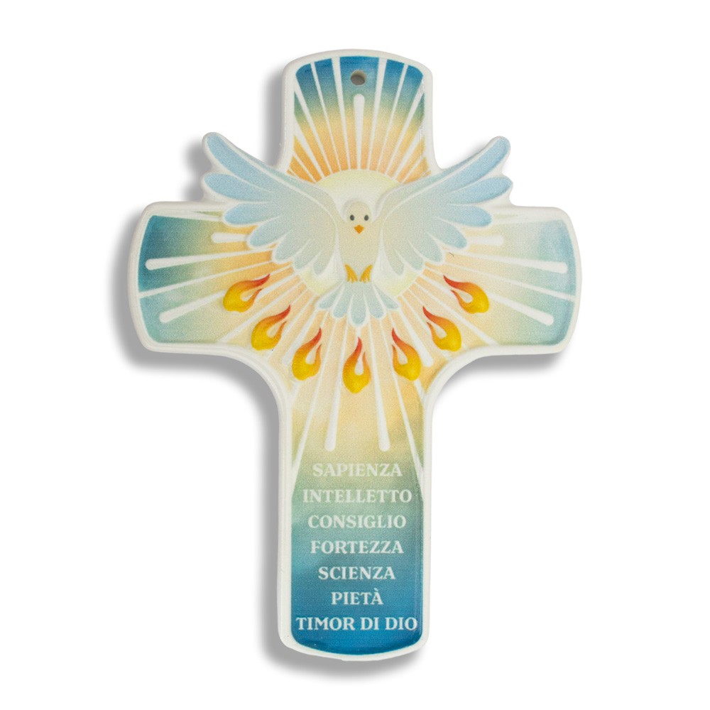 Croce Cresima in plex con immagine della Colomba e dei 7 doni.