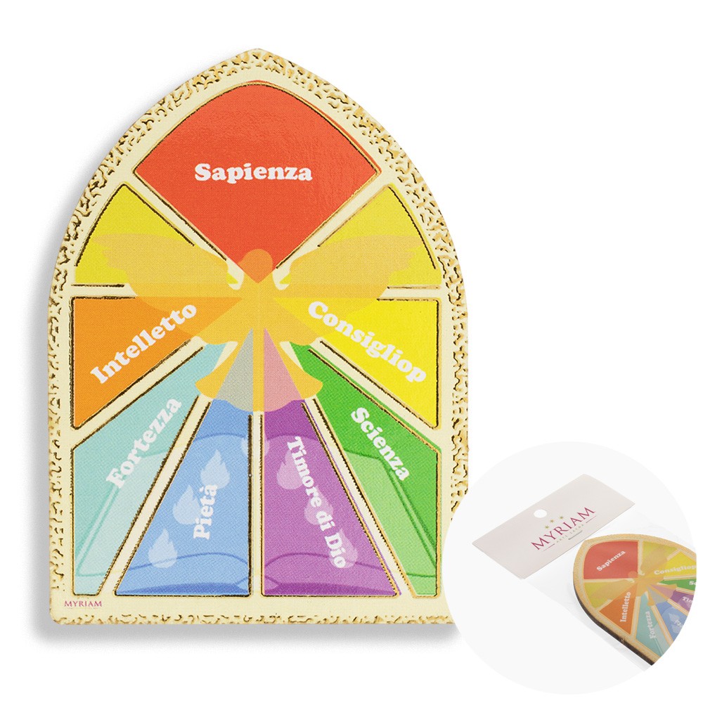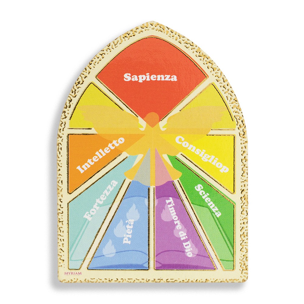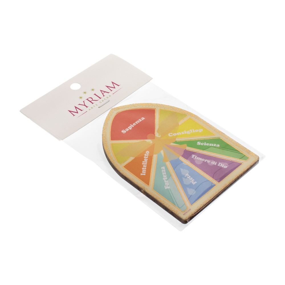 Carinissima calamita sagomato a forma di mini cupoletta decorata con immagine dei sette doni dello Spirito Santo, ideale come ricordino o segnaposto per la Cresima.