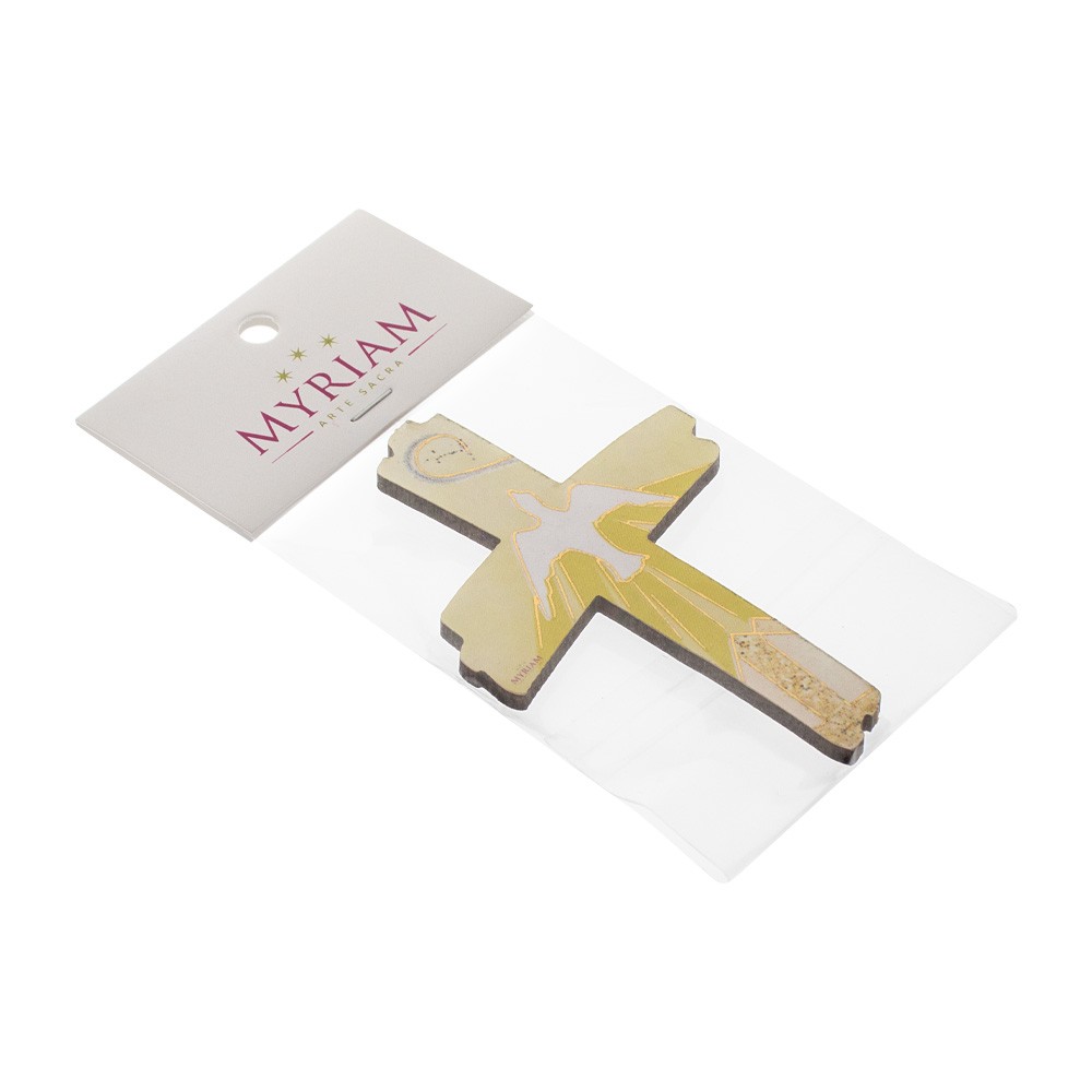 Il magnete è sagomato a forma di mini croce stilizzata con colomba decorata, ideale come ricordino o segnaposto per la Cresima.