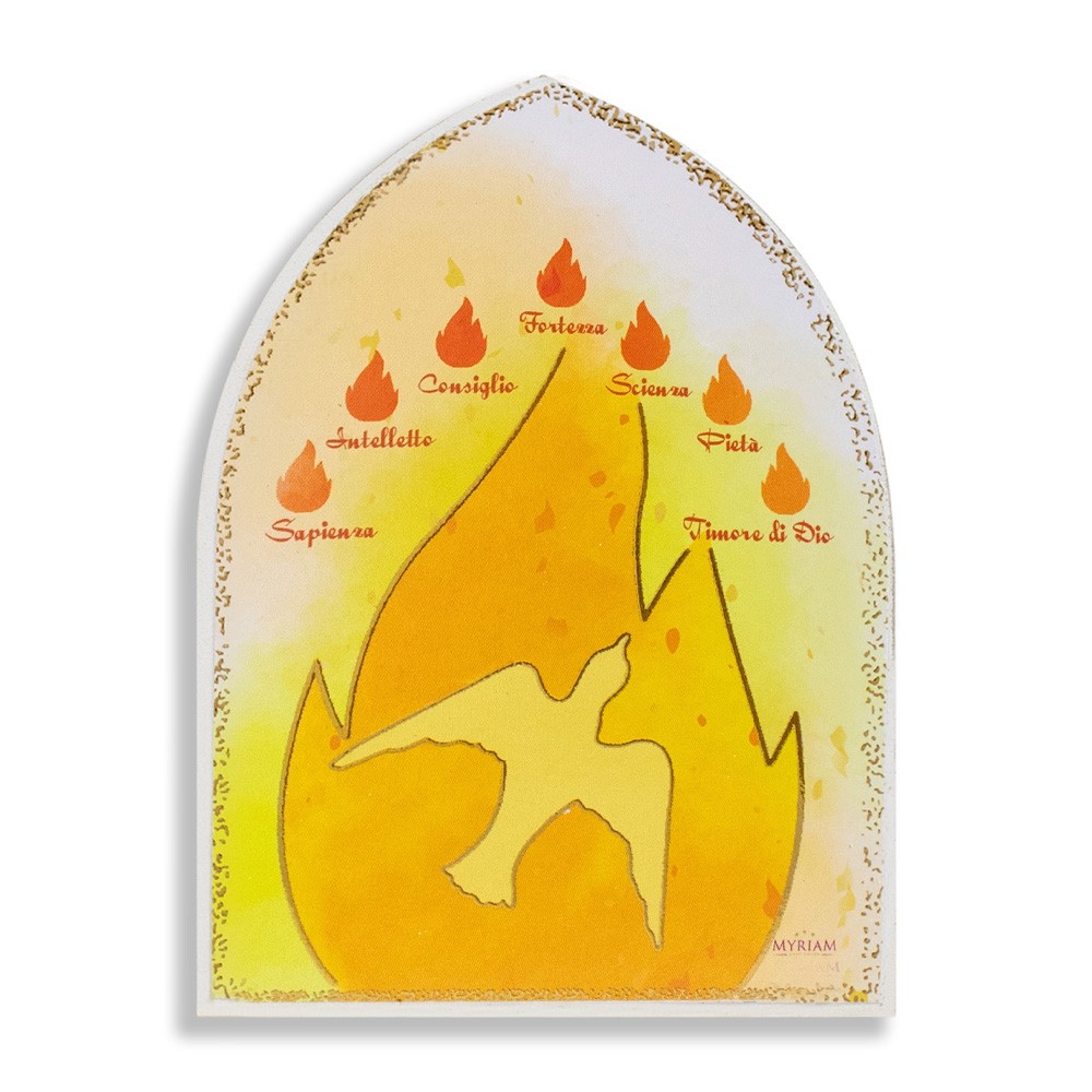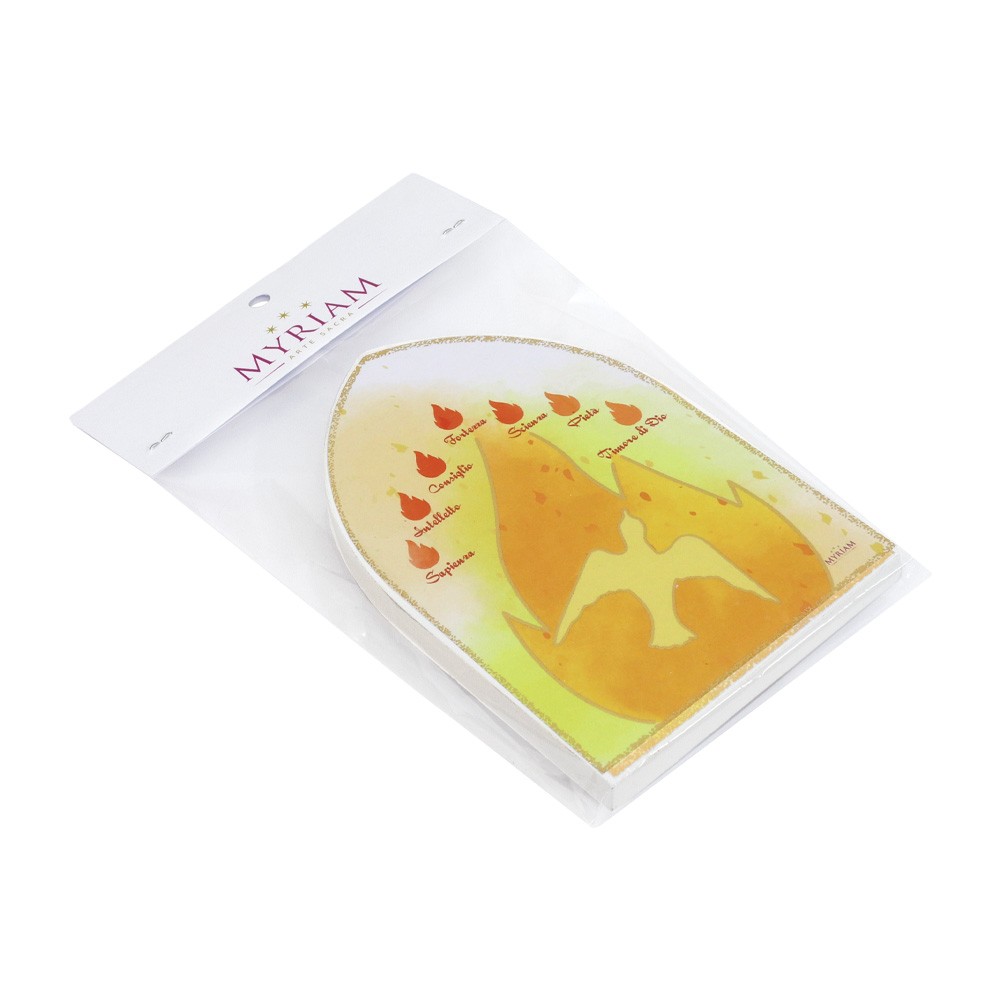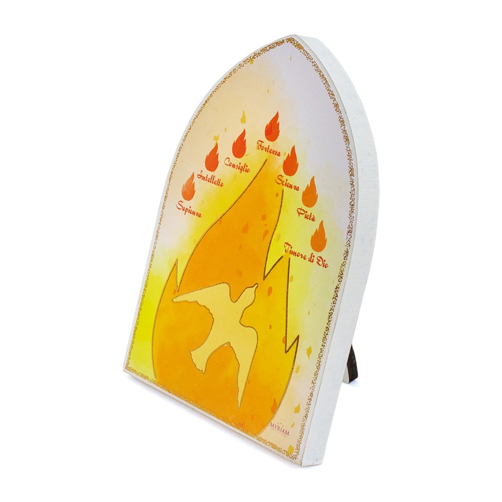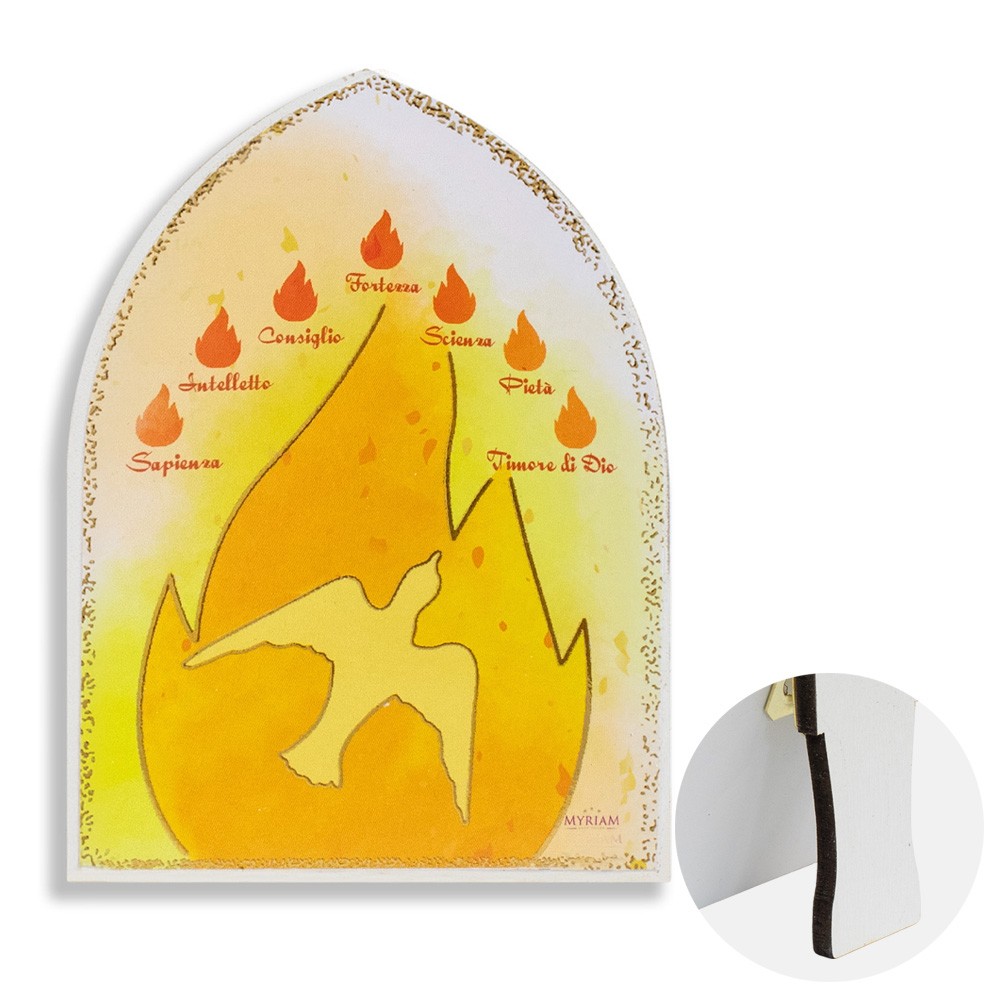 Quadretto con piedino a forma di cupola in legno MDF bianco con immagine stampata dei sette doni dello Spirito Santo e la Colomba.