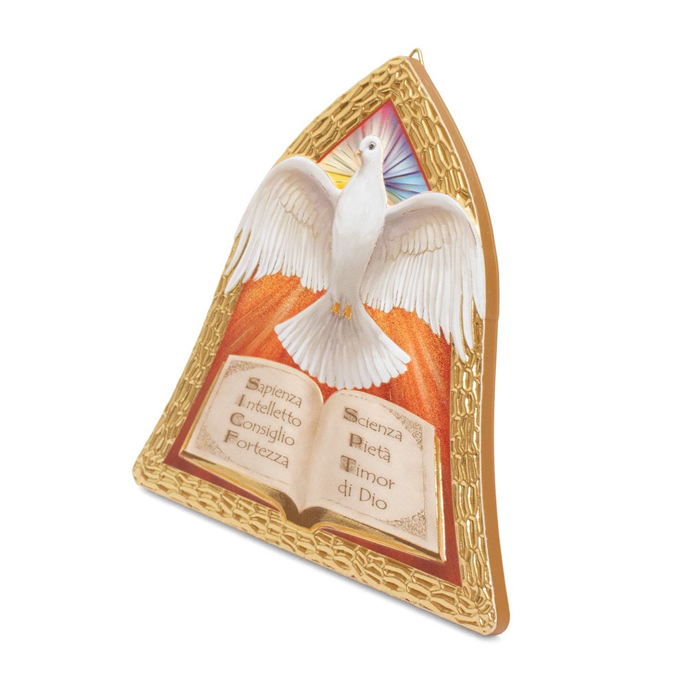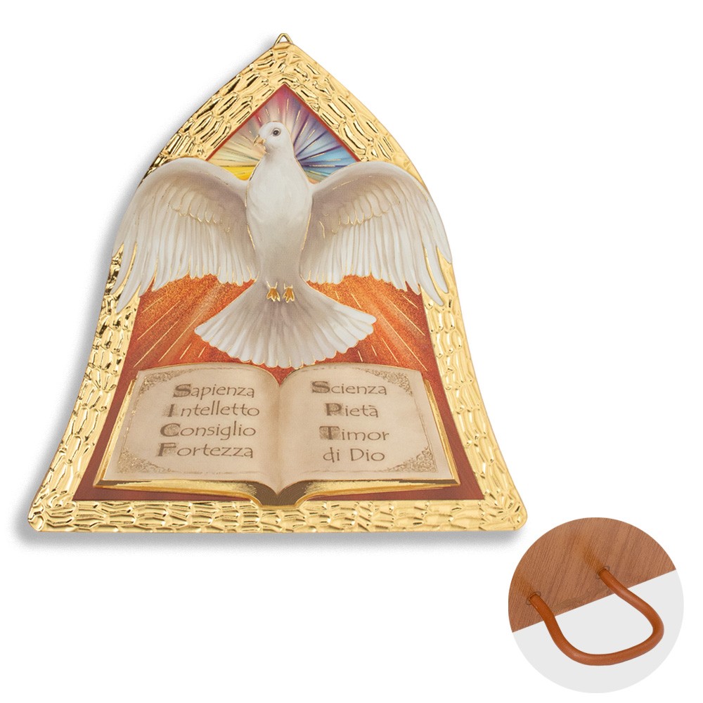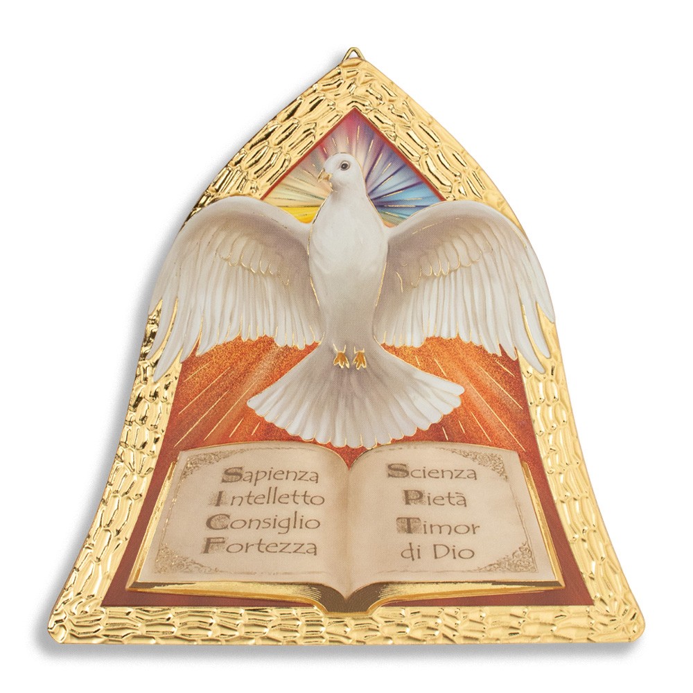 Quadretto sagomato a forma di campana decorato con immagine in rilievo della colomba e i 7 doni dello Spirito Santo.