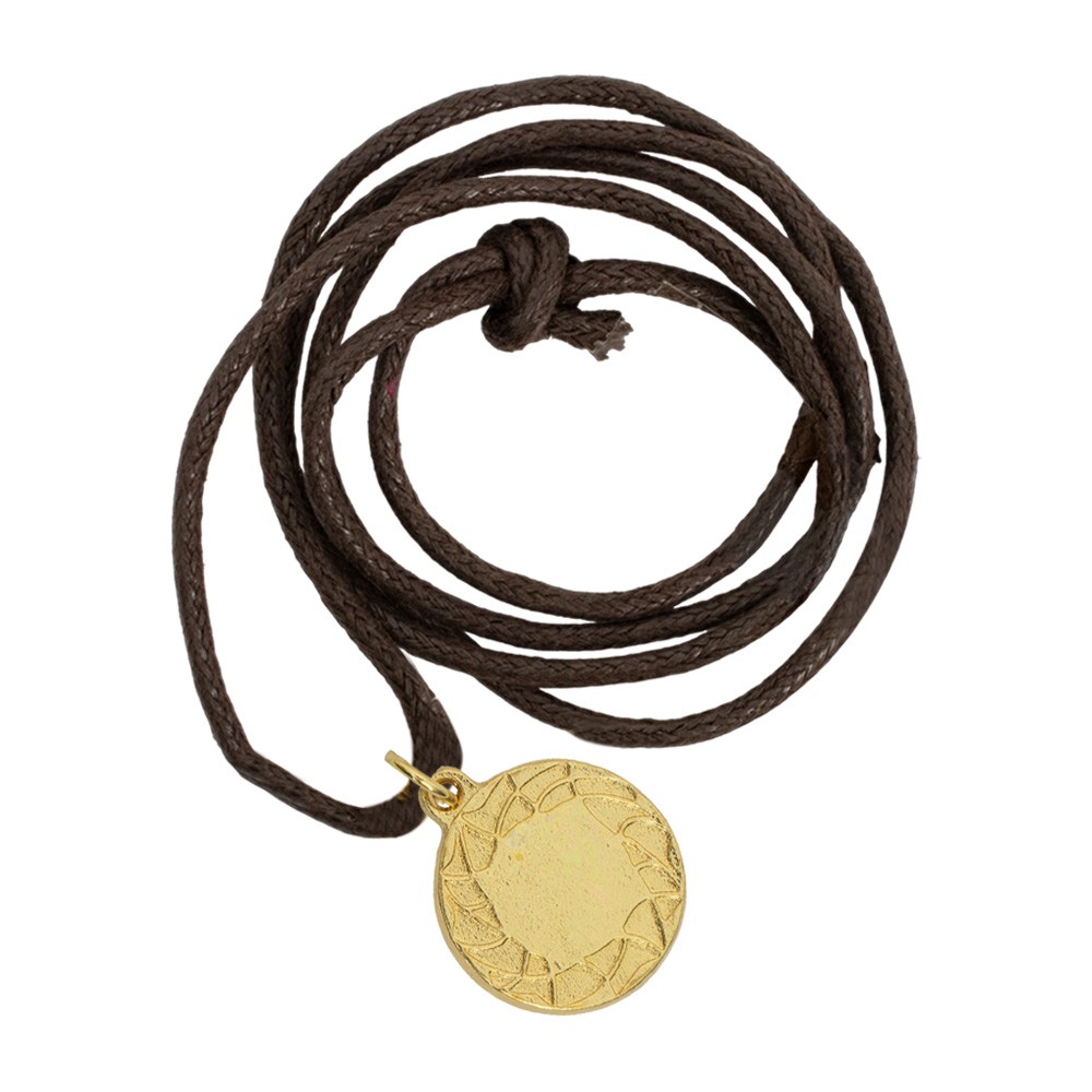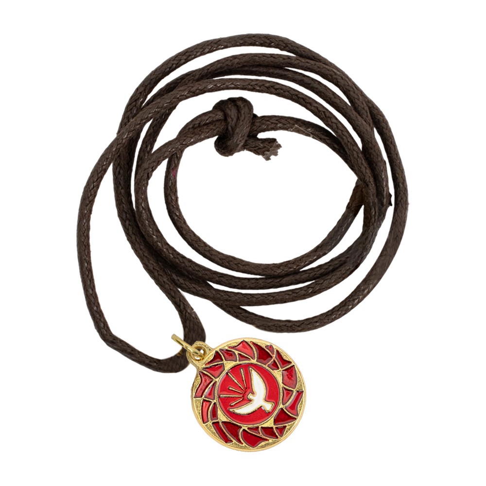 Pendente a forma di medaglietta tonda con inciso al centro la Colomba, realizzato in metallo color oro e smaltato bianco e rosso.