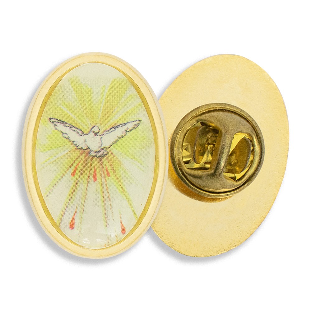 Spilla in metallo dorato con immagine smaltata che raffigura il simbolo dello Spirito Santo.